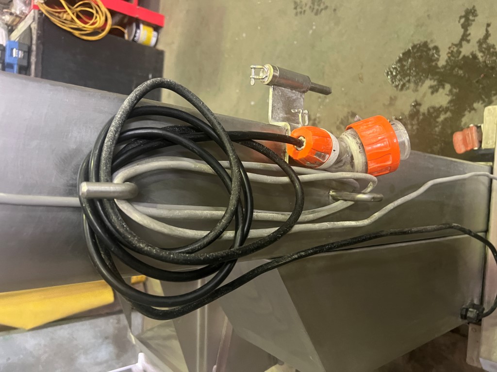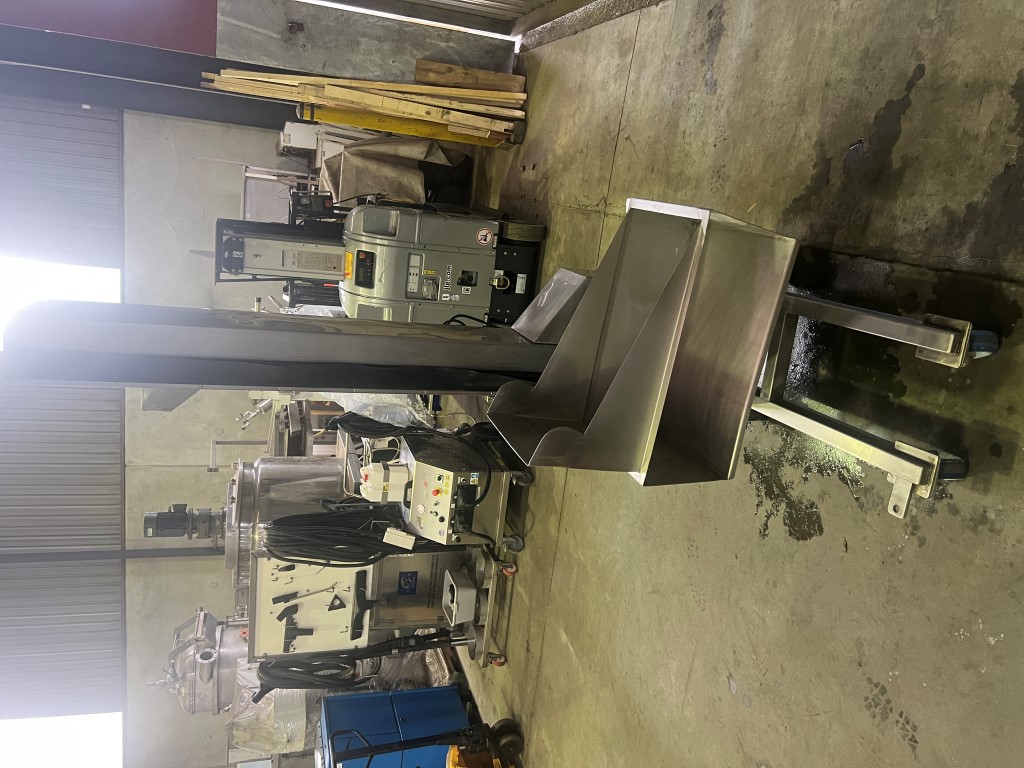 Bin Lifter/Tipper, 3 ph, up and down controls, stainless steel, on wheels, has tray that looks to be set up to take a plastic bin, tray size approx. 650mm x 420mm x 210mm H, discharge height approx. 1635mm H.