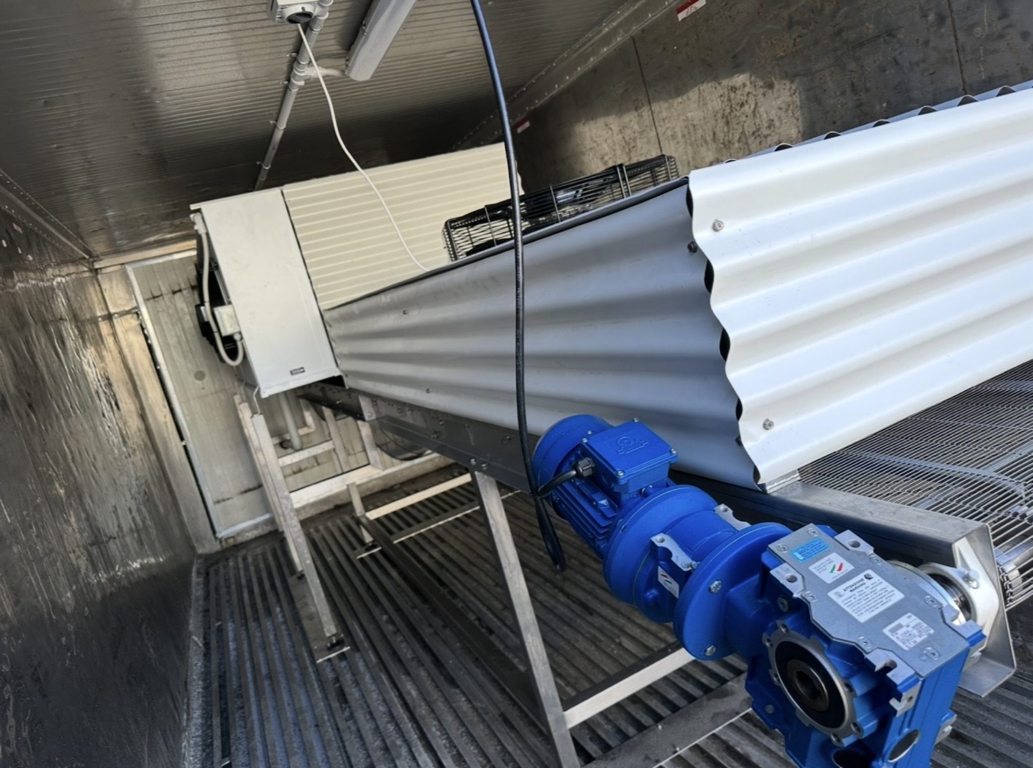 20ft Container Blast Freezer with product conveyor inside, built from new and used parts in 2025, was run at -20 degrees Celcius, refrigerant is R432a, conveyor is approx. 900mm W x 5.5m L and has variable speed control, product entry point hole in container (max product height 20mm, modifications to the unit could be made to take a taller product), at the outfeed end the product then fell off belt into a bin (bin not included). Previously used to Blast Freeze Fries (13mm).