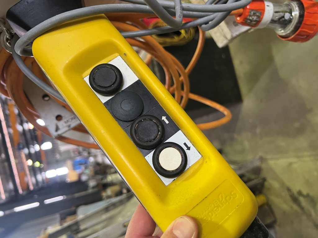 Bowl Lifter/Tipper, mac.pan, 3 ph, on wheels, has 3 tipping heights that can be selected (requires steel bracket to be moved), was used to lift and tip 400L Bakery Bowls, space for bowl looks to be approx. 1100mm Ø x 900mm H, lift/tipping height approx. 2070mm.