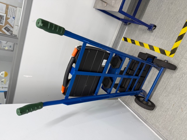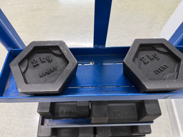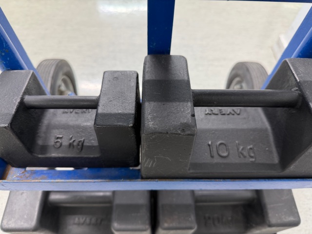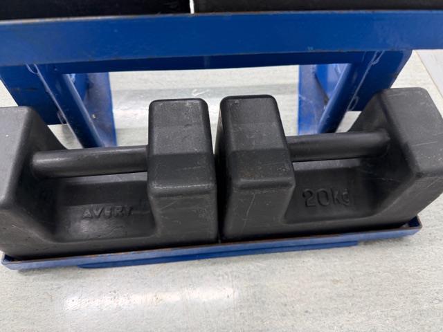 Calibration Weights on custom mobile frame, weights include 2 x 2kg, 1 x 5kg, 1 x 10kg and 2 x 20kg. Used to calibrate scales.