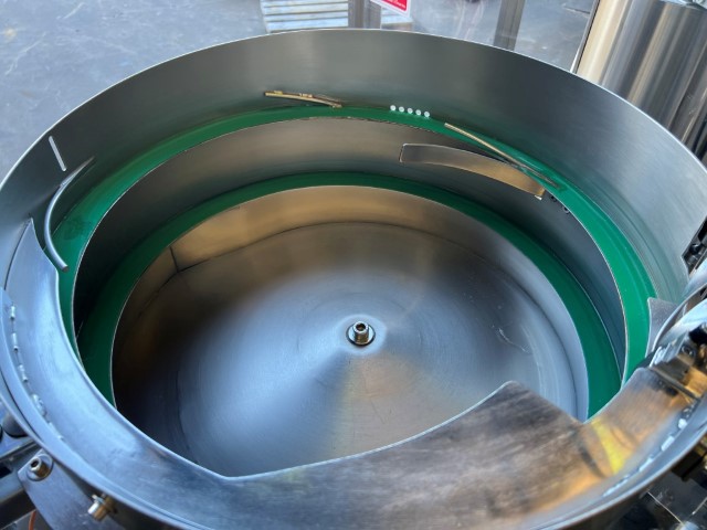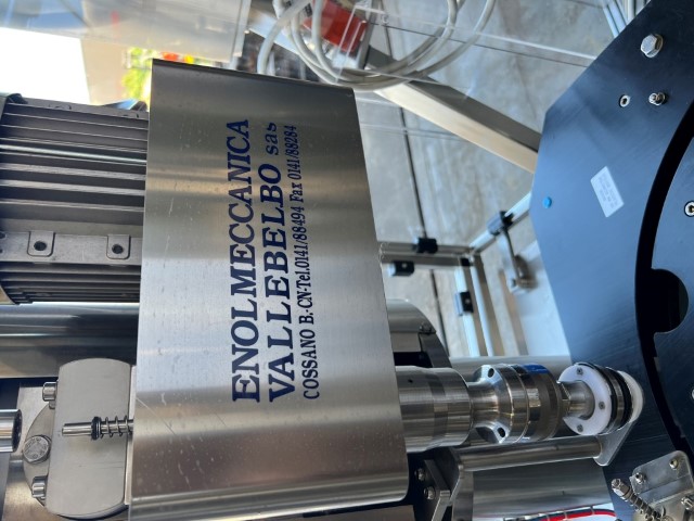 Enolmeccanica Vallebelbo Capper, model MT/PK, YOM 2010, single phase, pneumatic, stainless steel, for plastic screw caps, 2 different cap bowl feeders, star wheels for small bottles (approx. 50mm Ø, 42mm Ø and 34mm Ø), conveyor belt approx. 3m L x 82mm W.