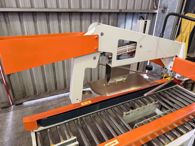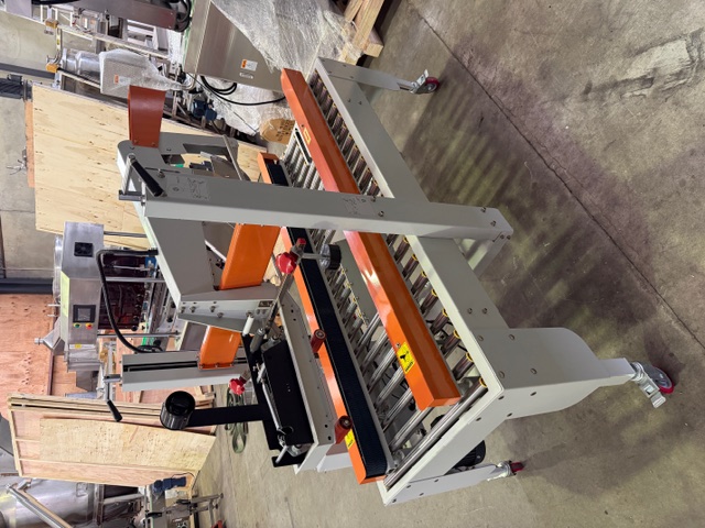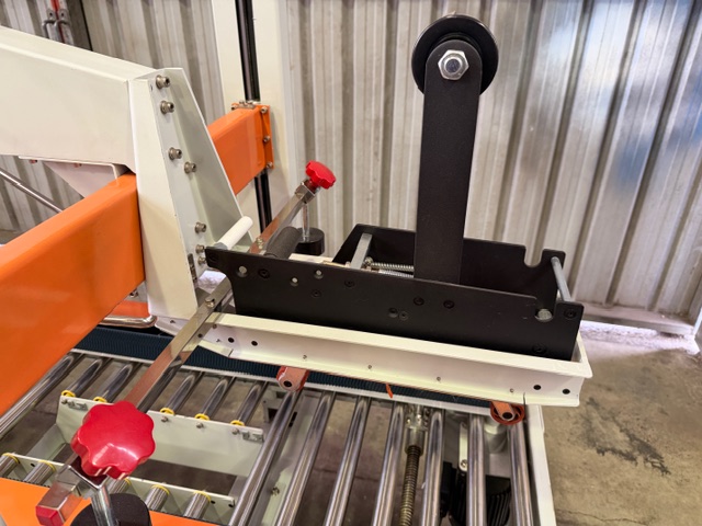 Carton Taper, looks to be 3 phase (4 wires), pneumatic, side mounted conveyors, only fitted with top taping head (no bottom head), has flap closing device, on wheels, approx. box sizes 180-500mm W x 170-500mm H. Appears to have done very little work.