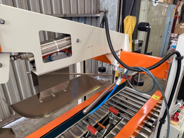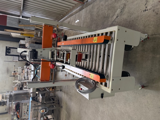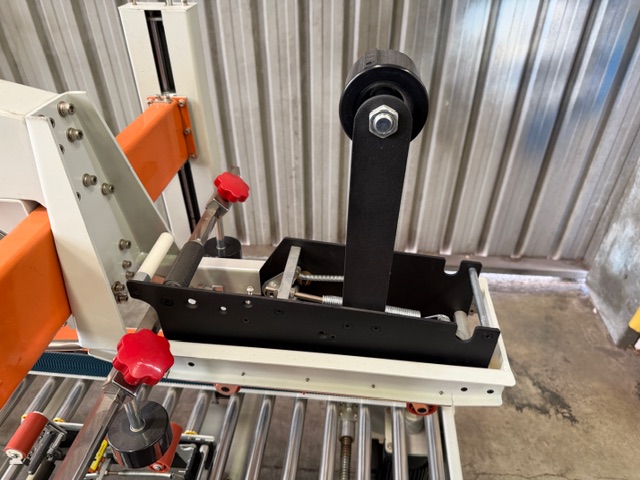 Carton Taper, looks to be 3 phase (4 wires), pneumatic, side mounted conveyors, fitted with top and bottom taping heads, has flap closing device, on wheels, approx. box sizes 180-500mm W x 170-500mm H. Appears to have done very little work.
