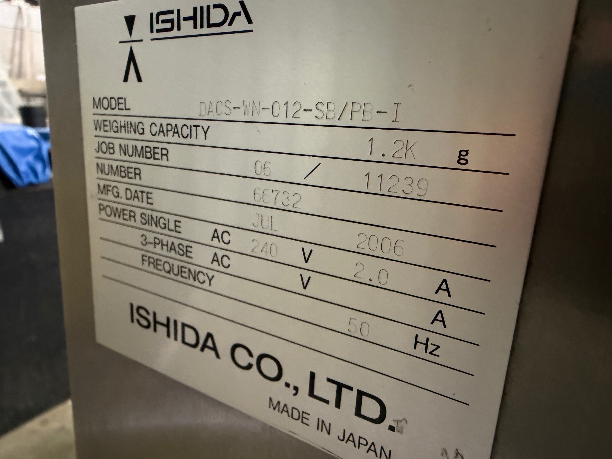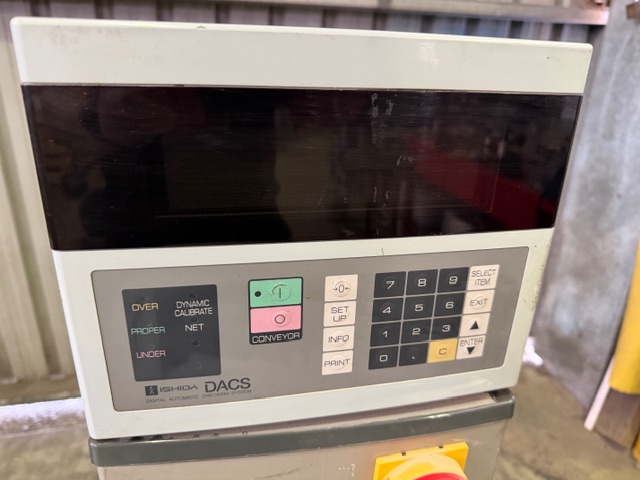 Ishida DACS-WN-012-SB/PB-I Check Weigher, YOM 2006, single phase, reject arm, weighing capacity 1200g, weigh belt dimensions approx. 350mm L x 230mm W, unit operates from right to left. Last calibrated May 2025. Belts could do with replacing.