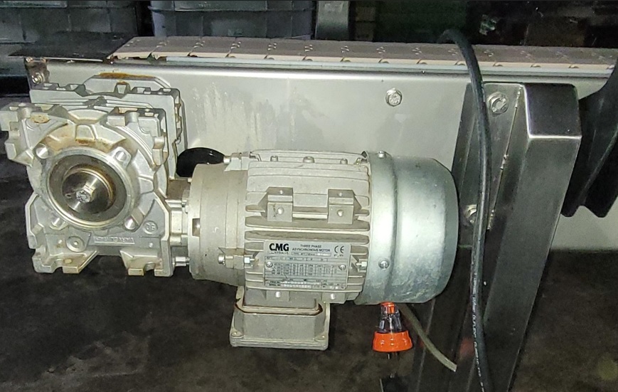 Hunter Belt Conveyor, single phase, stainless steel frame, plastic slatband belt, has feet and wheels. Ex Capper belt conveyor.