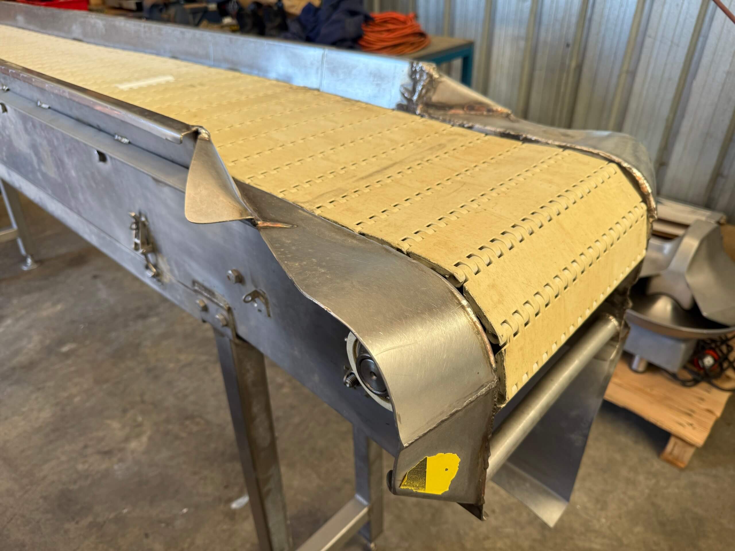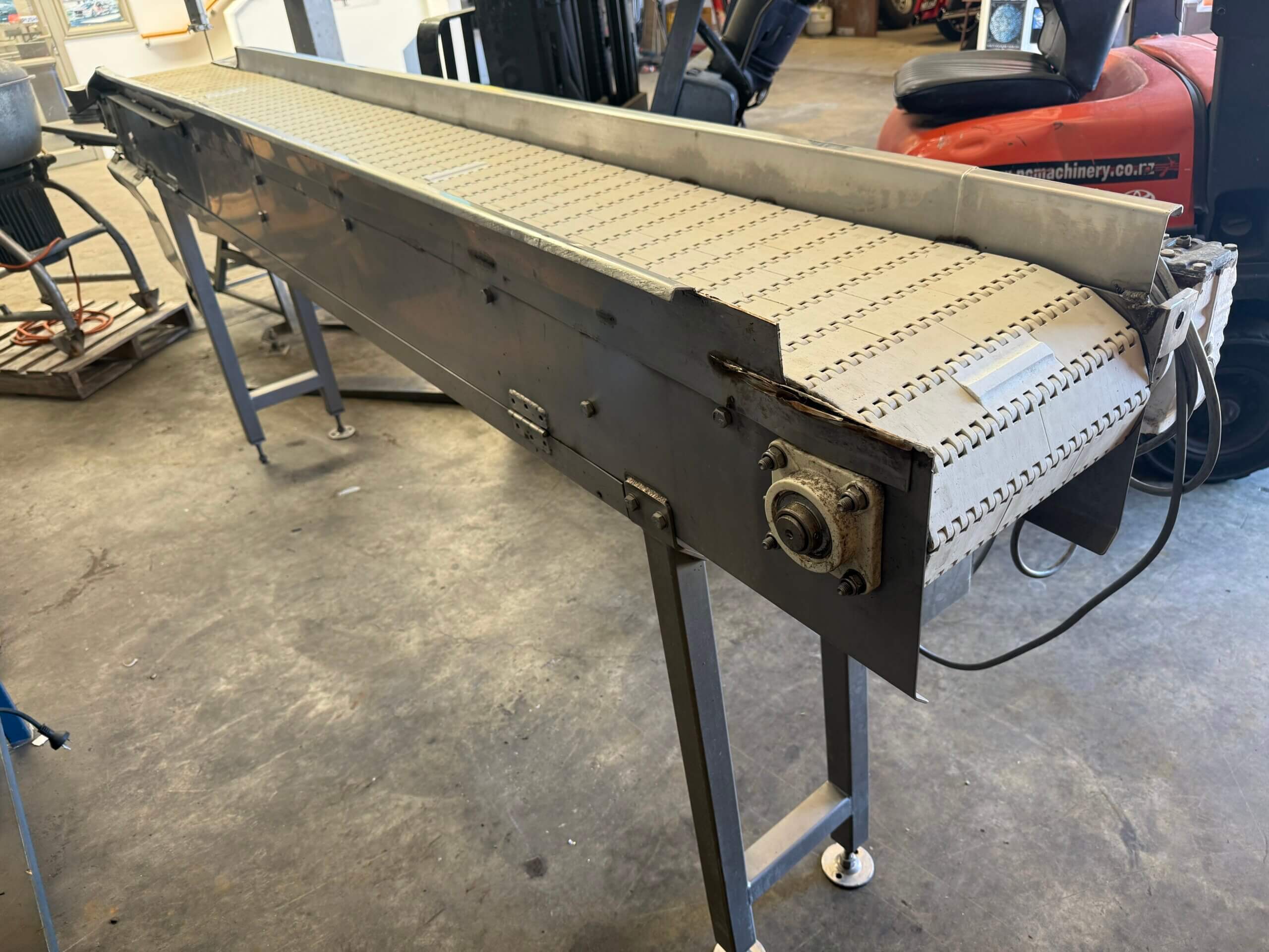 Belt Conveyor, 3 ph, variable speed, plastic Intralox belt, stainless steel frame.