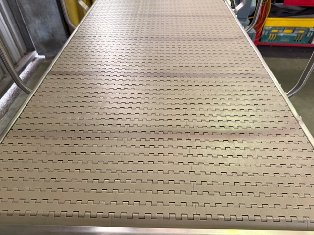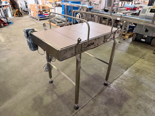 Joyea Belt Conveyor, 3 ph, SEW Eurodrive 0.25kw motor, 1300/84 rpm, stainless steel frame, plastic slatband belt.