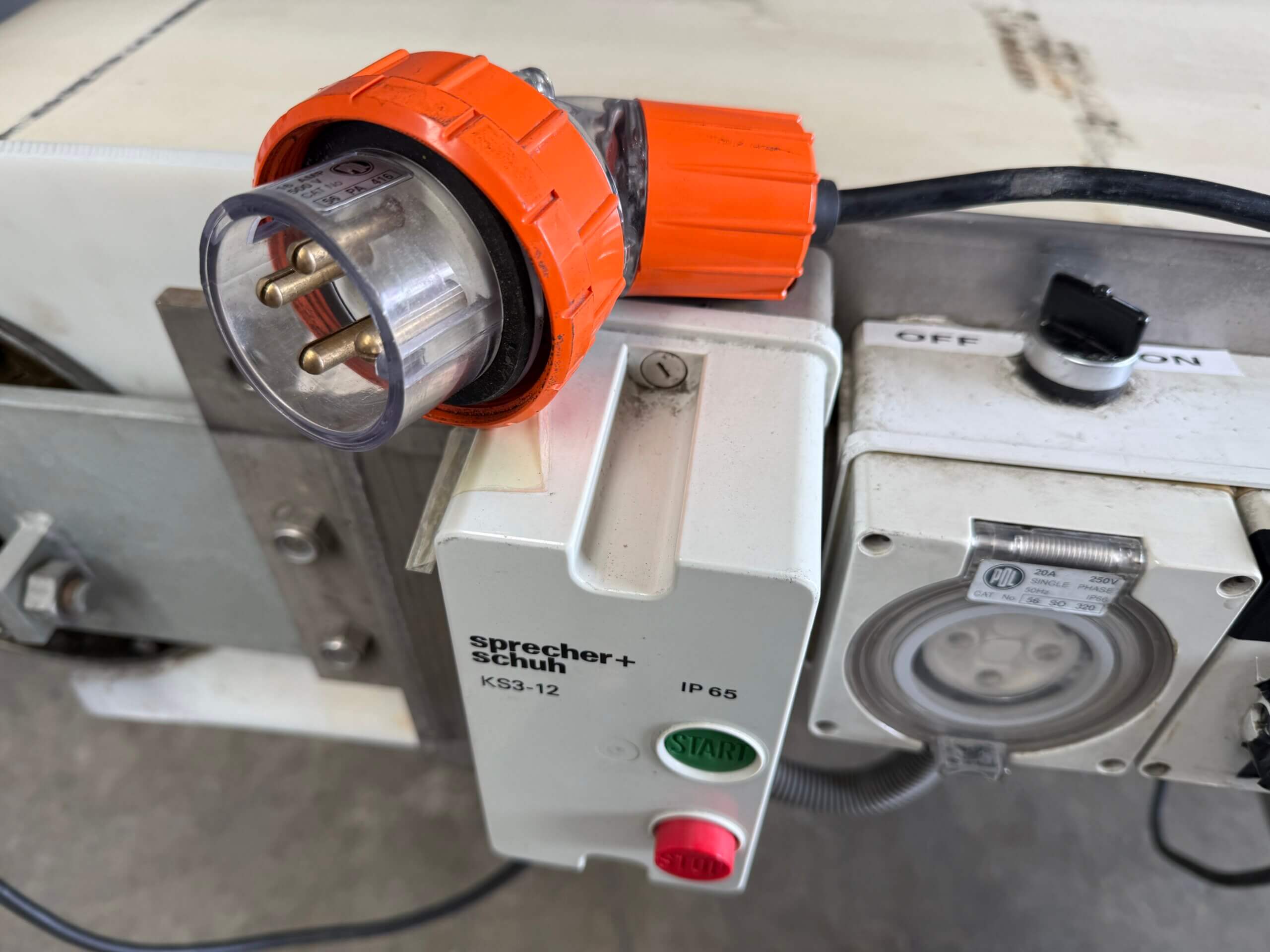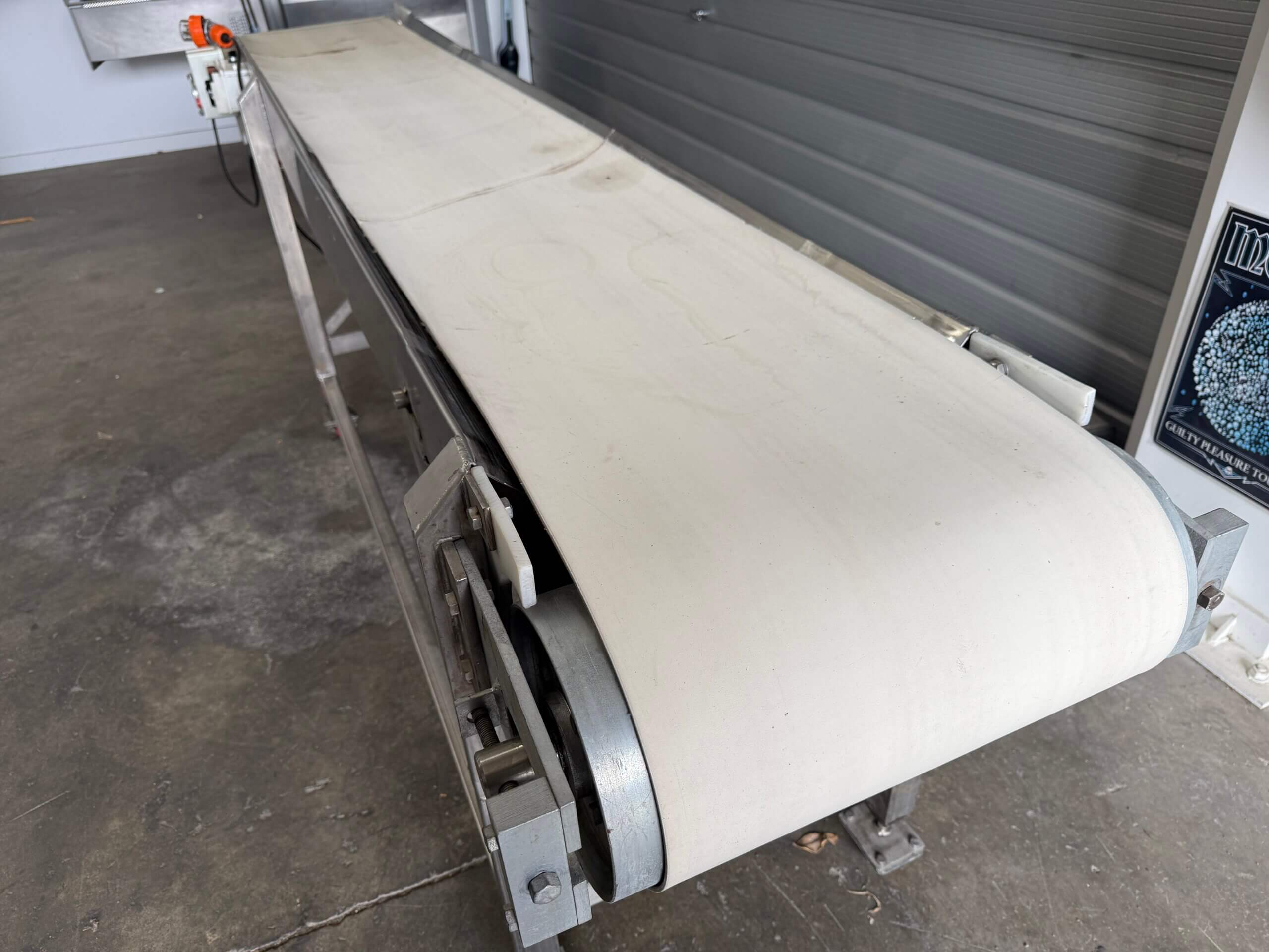 Belt Conveyor, 3 ph (4 pin plug), RR Fisher drum roller motor, start/stop buttons, stainless steel frame, on wheels, white belt.