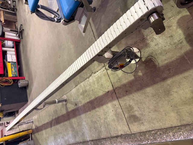 Joyea Belt Conveyor, 3 ph, SEW Eurodrive 0.25kw motor, 1300/34 rpm, stainless steel frame, plastic slatband belt.
