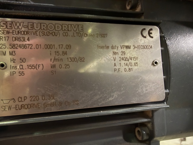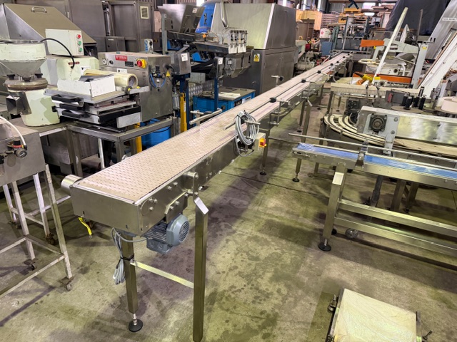 Belt Conveyor, 3 ph, SEW Eurodrive 0.25kw motor, 1300/82 rpm, stainless steel frame, plastic slat belt, some guide rails.