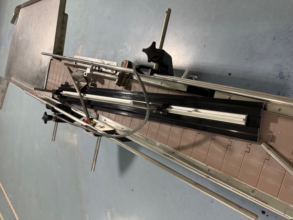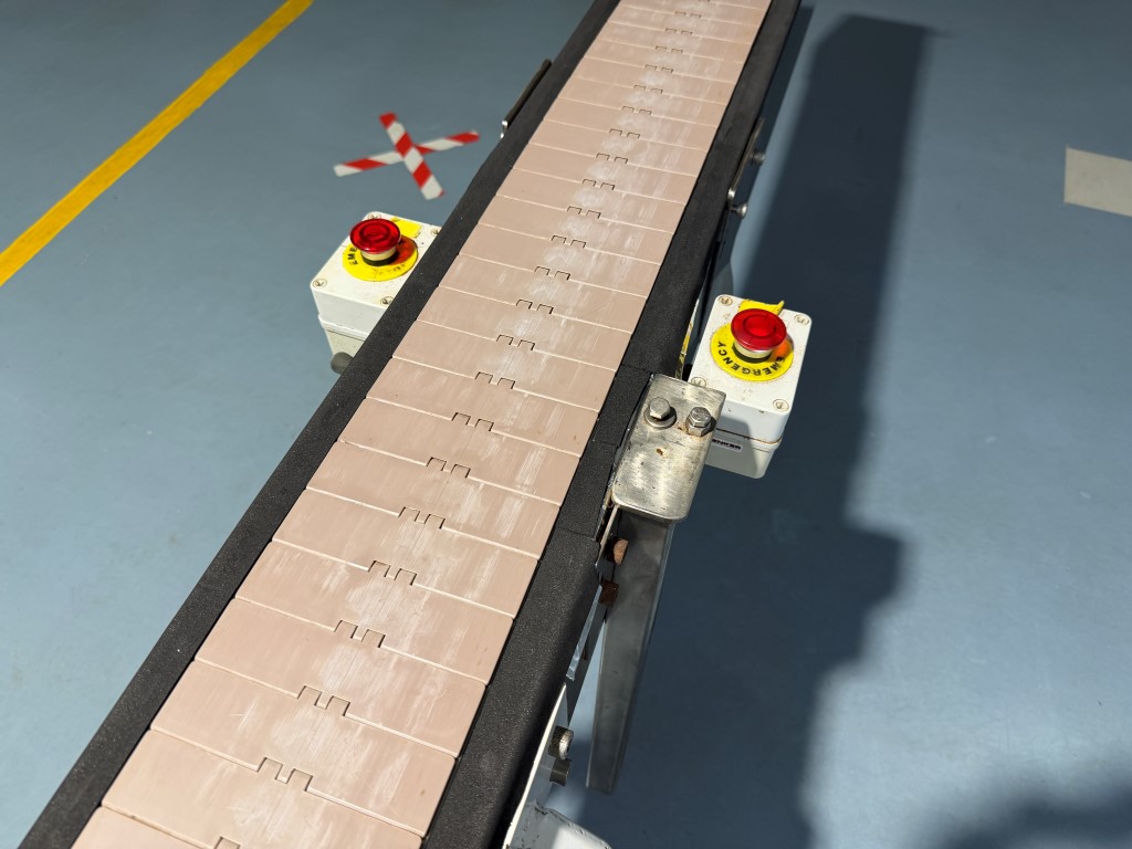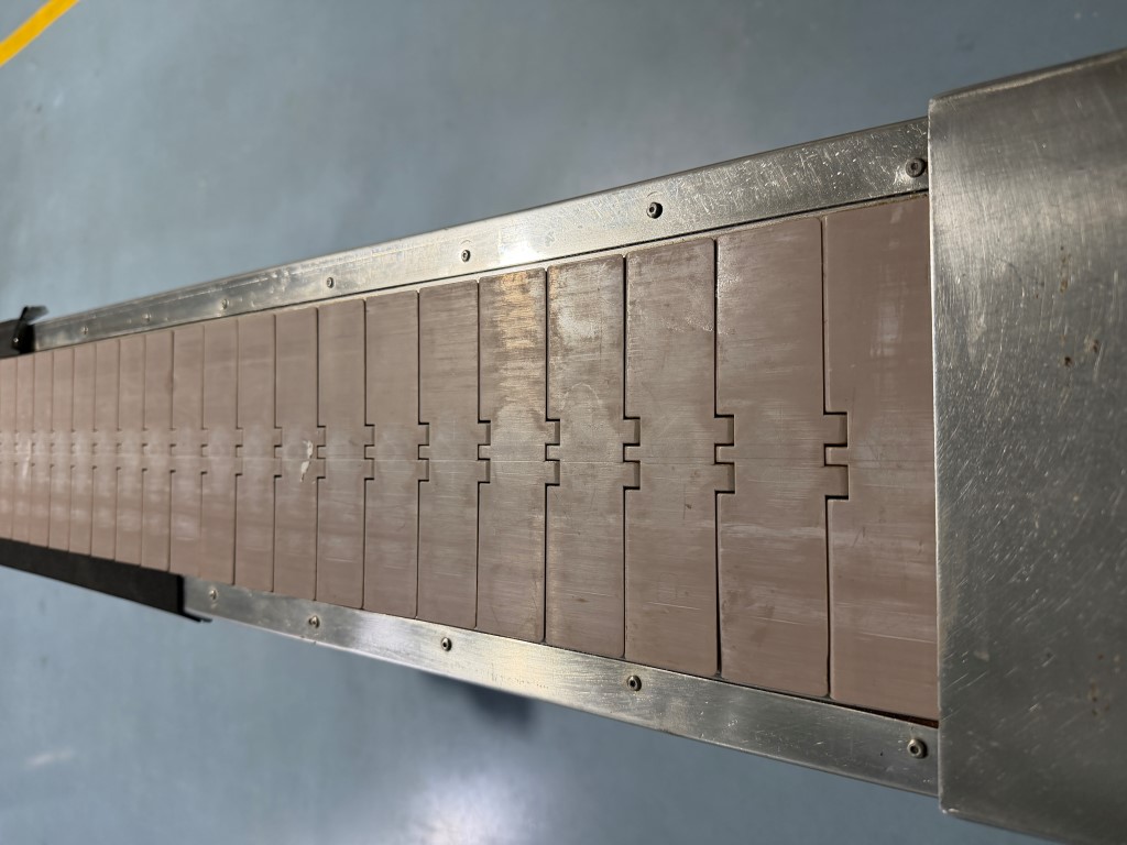 Belt Conveyor, single phase, variable speed, plastic slatband belt, stainless steel sides, painted steel legs.