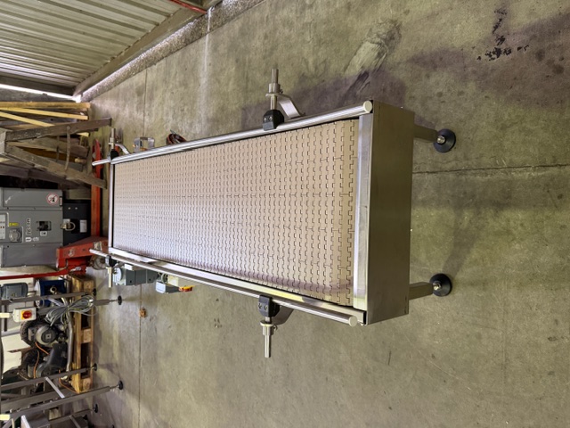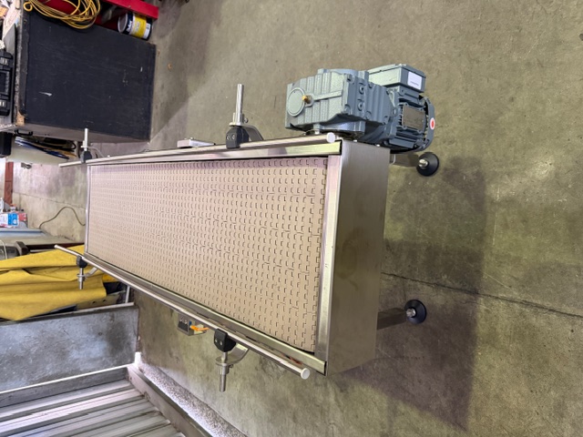 3 x Belt Conveyors, YOM 2017, 3 ph, 0.37kw, 1380/15 rpm, plastic slatband belts, stainless steel frames, adjustable height feet, guide rails (1 conveyor has only 1 guide rail).