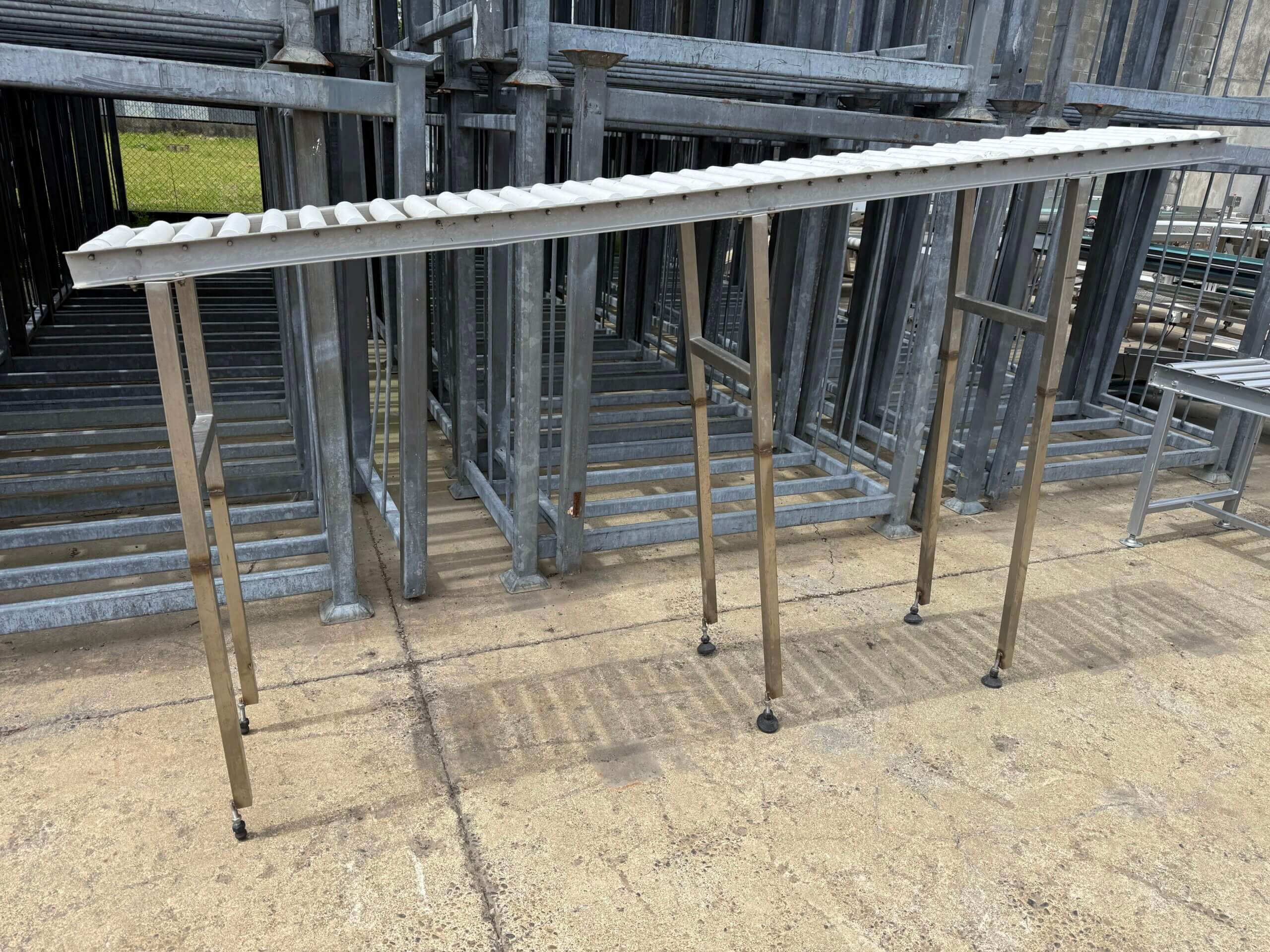 Roller Conveyor, stainless steel frame, rollers measure 345mm L x 50mm Ø, spaced every 75mm centre/centre. Legs could be cut down to desired height.