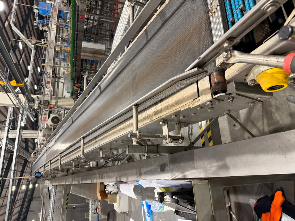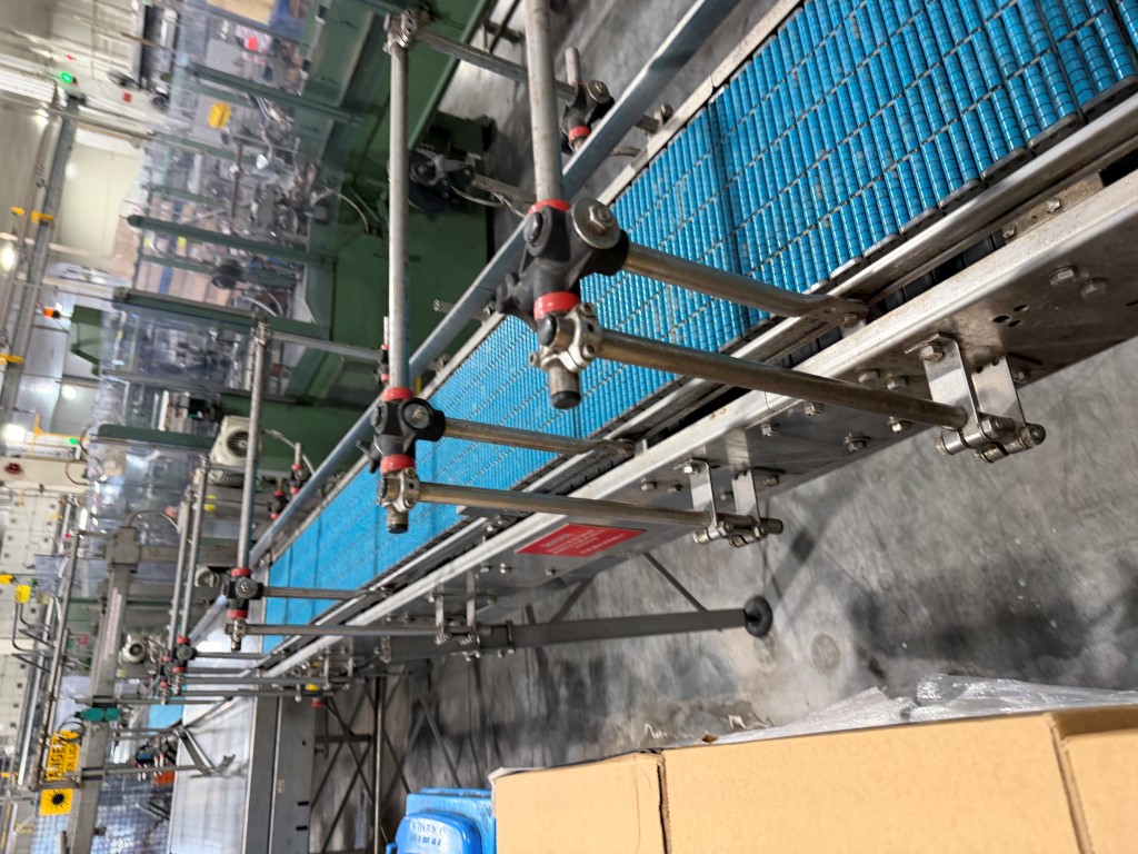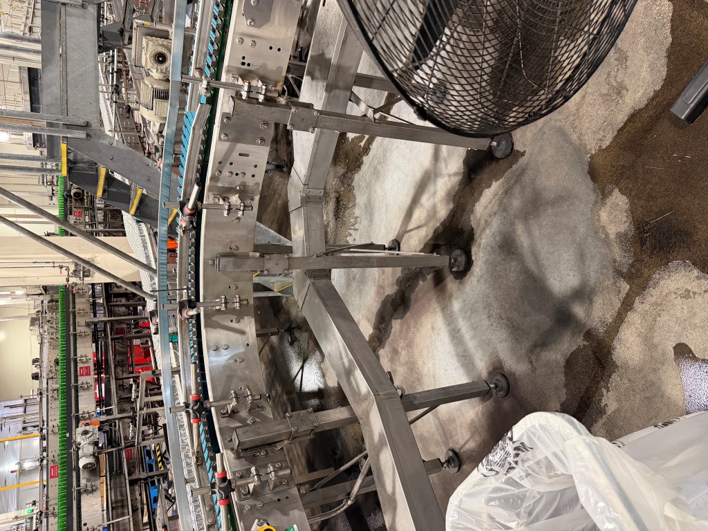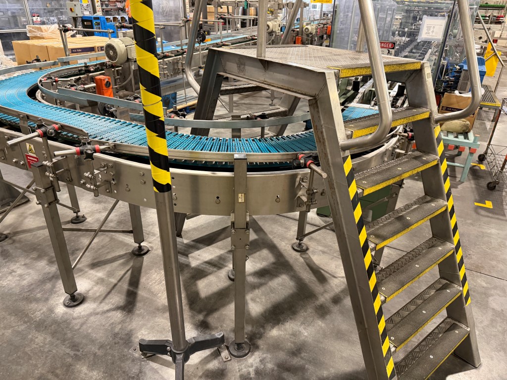 Various Conveyors, available in straight lengths and turns, stainless steel frames, previously used to convey trays and cartons. Available May 2026.