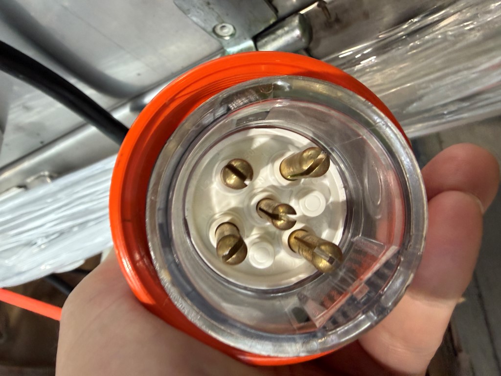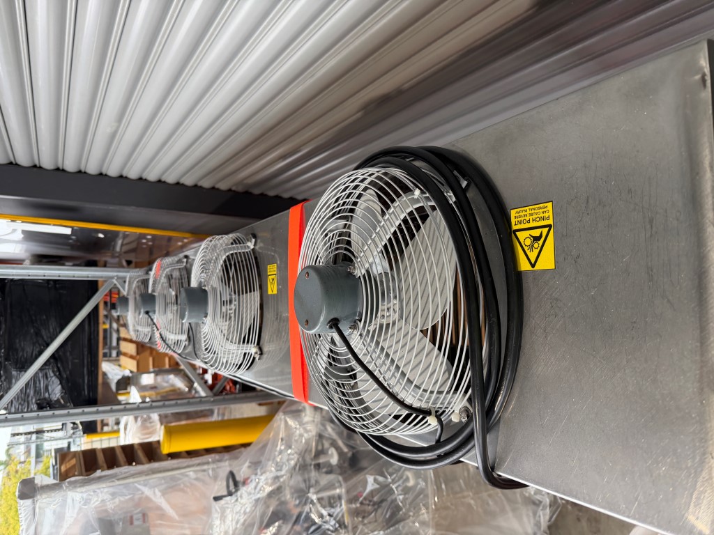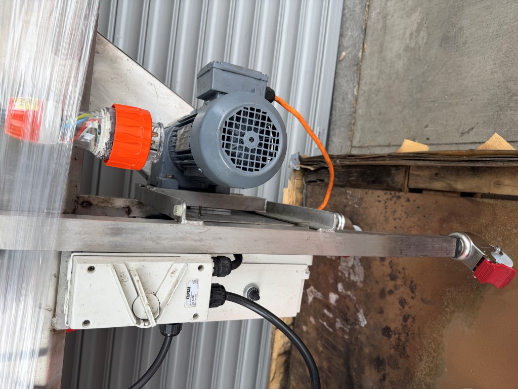Cooling Conveyor, 3 ph, 5 pin 500v 20amp plug, variable speed control, 316 stainless steel, fully refurbished and not used since, has 4 top mounted fans, on wheels.