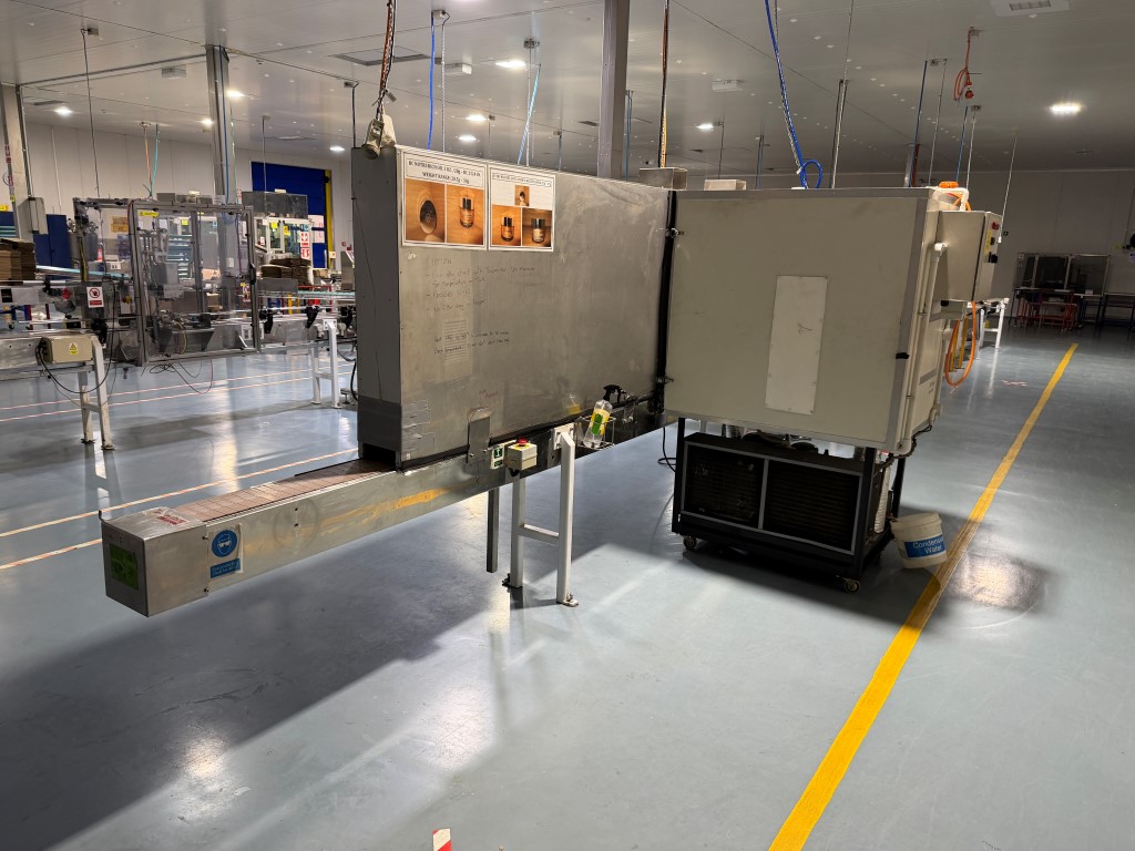 Cooling Tunnel, 3 ph (32amp plug), conveyorised (approx. 150mm W x 11.5-12m L), tunnel aperture approx. 150mm W x 60mm H, ex cosmetic oil cooling unit. Induction Sealer shown in photos not included. Available from second half of February 2026.