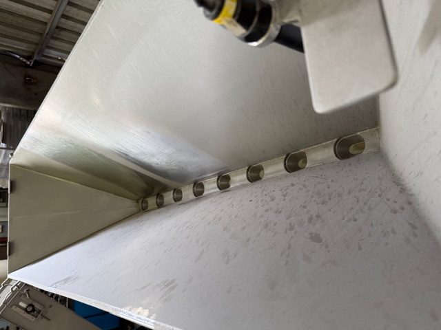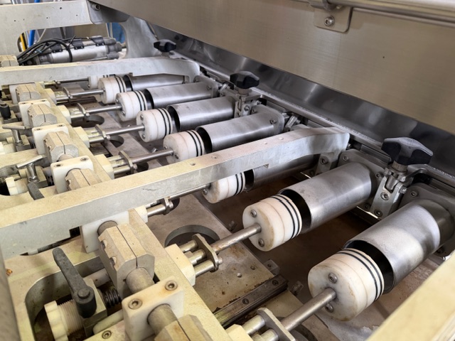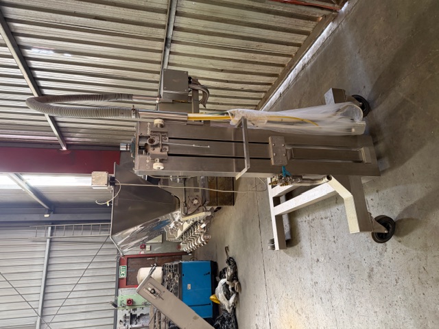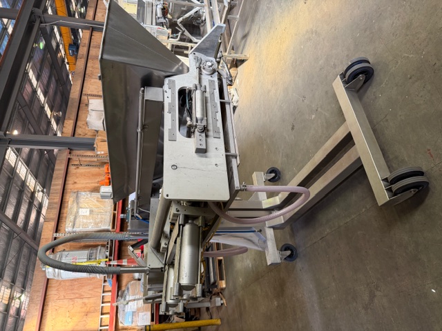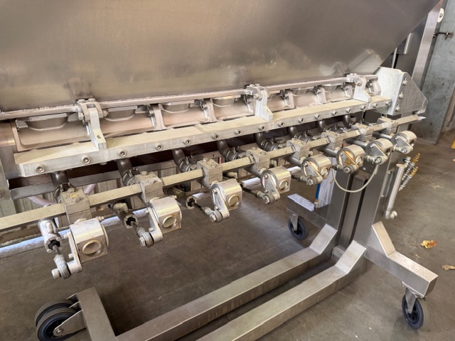 Depositor, 8 head, stainless steel, on wheels, pneumatic, hopper scraper attachment, product cylinders are approx. 80mm Ø x 200mm L, pistons are approx. 70mm L. If pistons are all the way in the max fill size would be approx. 650ml per head. Ex Food Industry unit.
