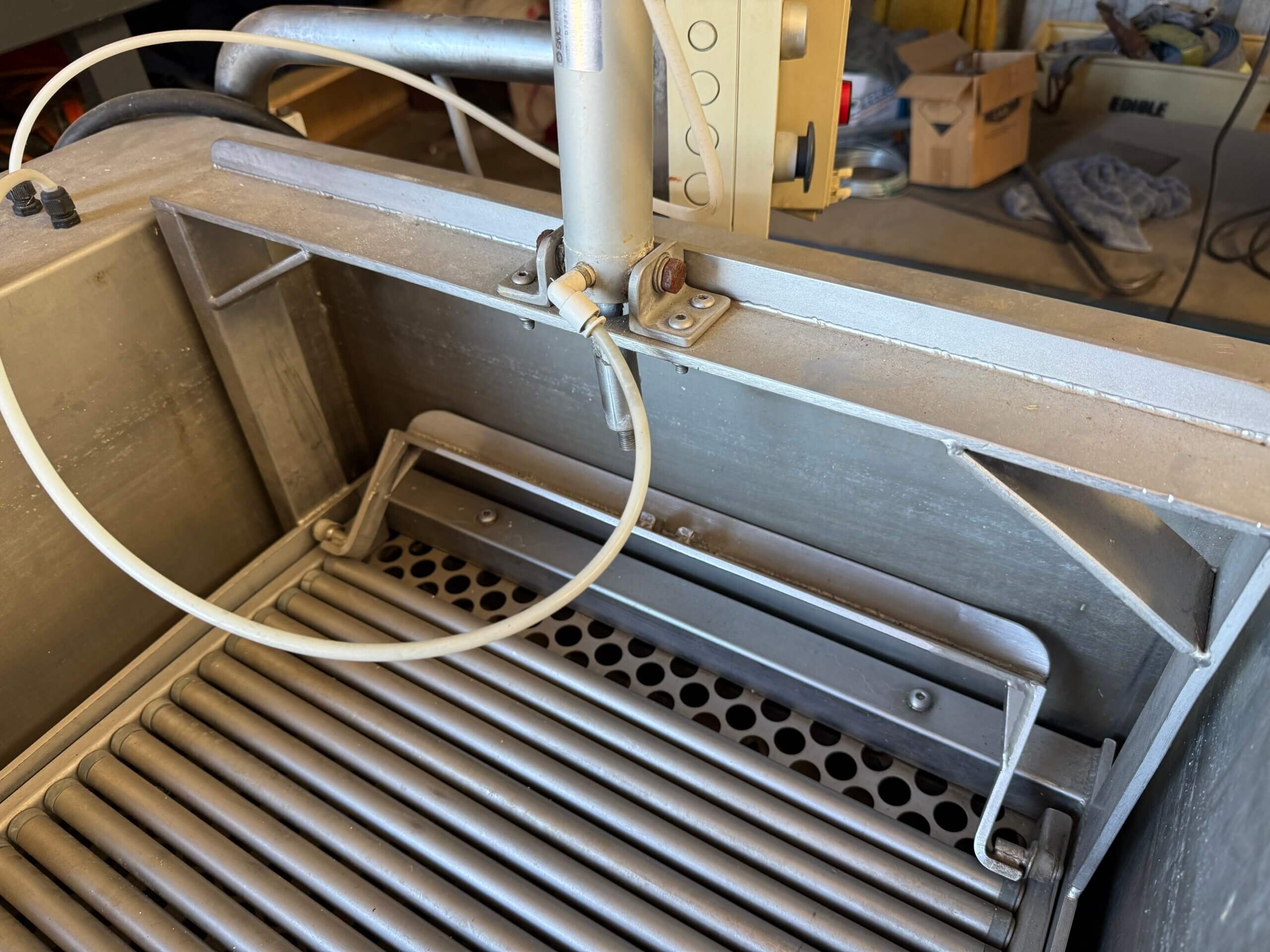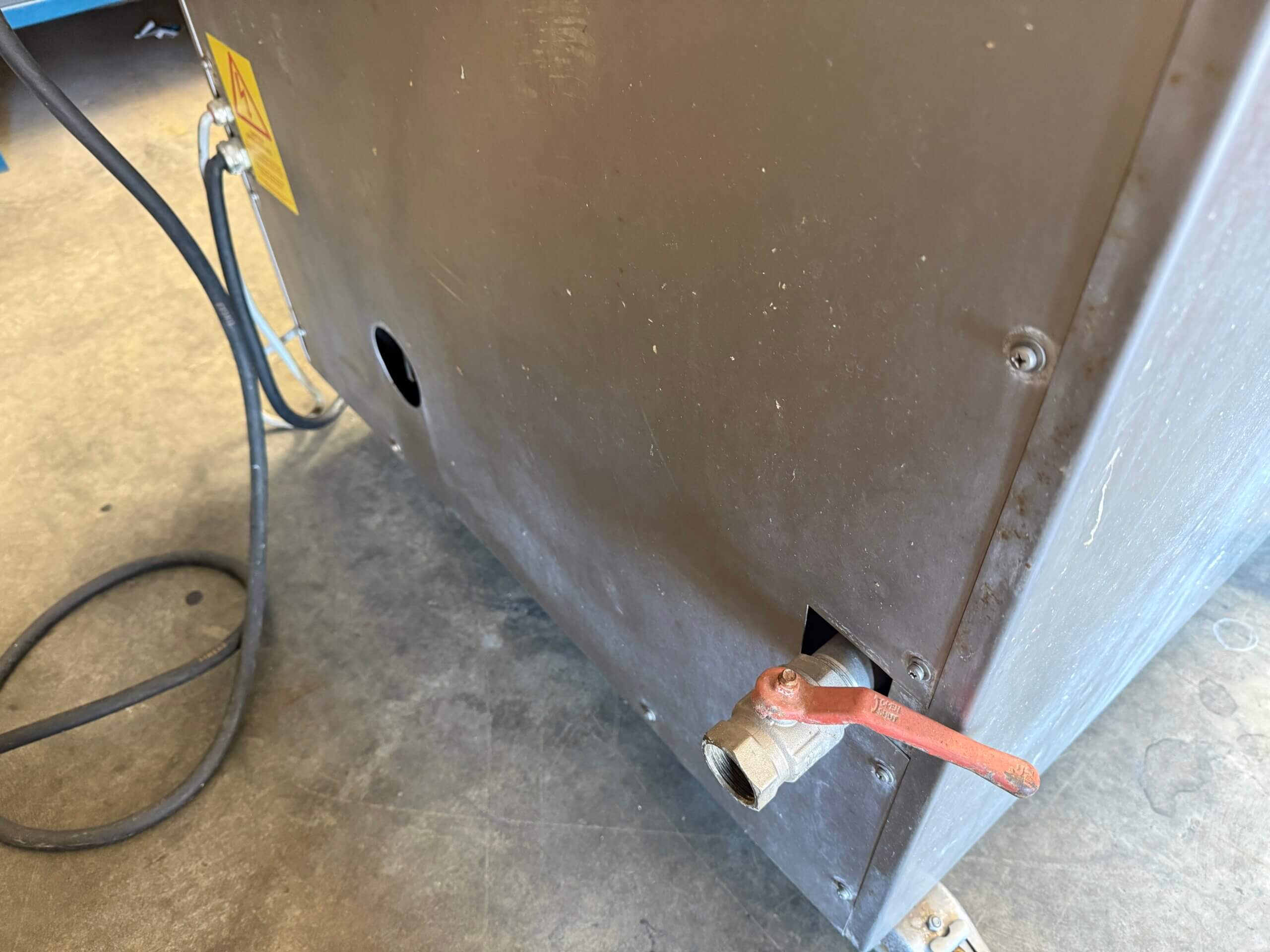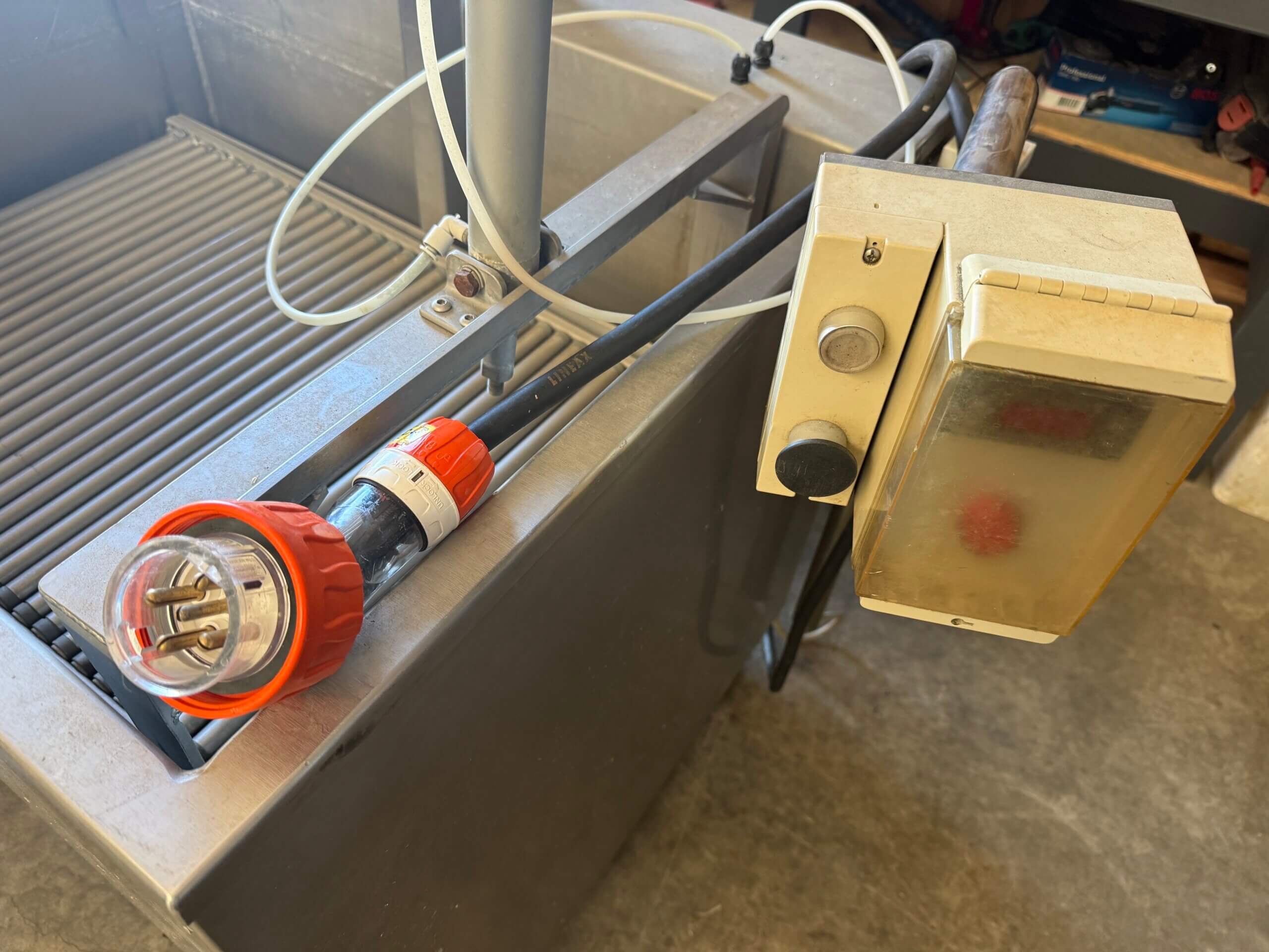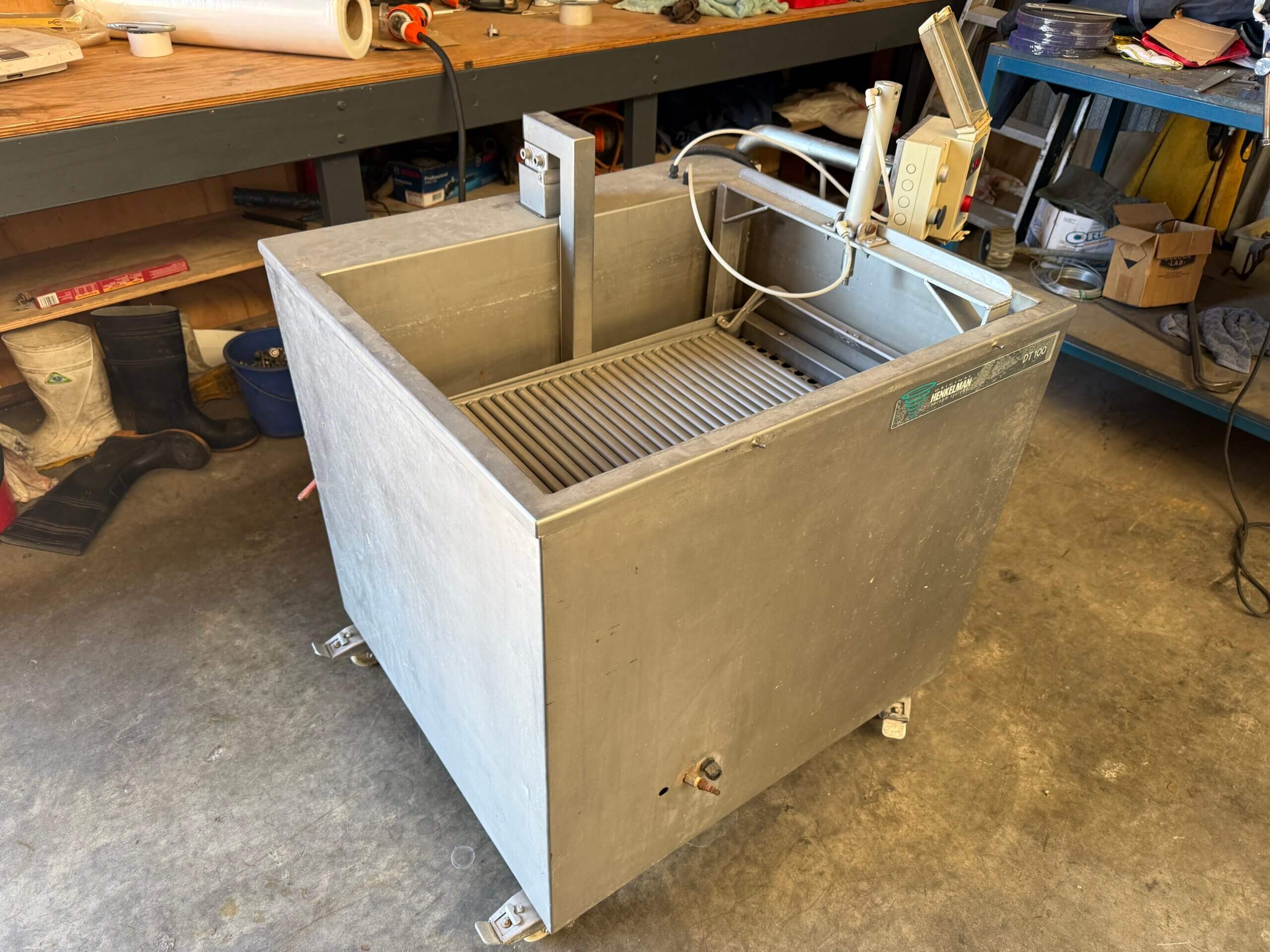 Henkelman DT100 Dip Tank, 3 ph, stainless steel, on wheels. Heats and works well, apart from Ram that lifts the roller on a slight angle is broken.