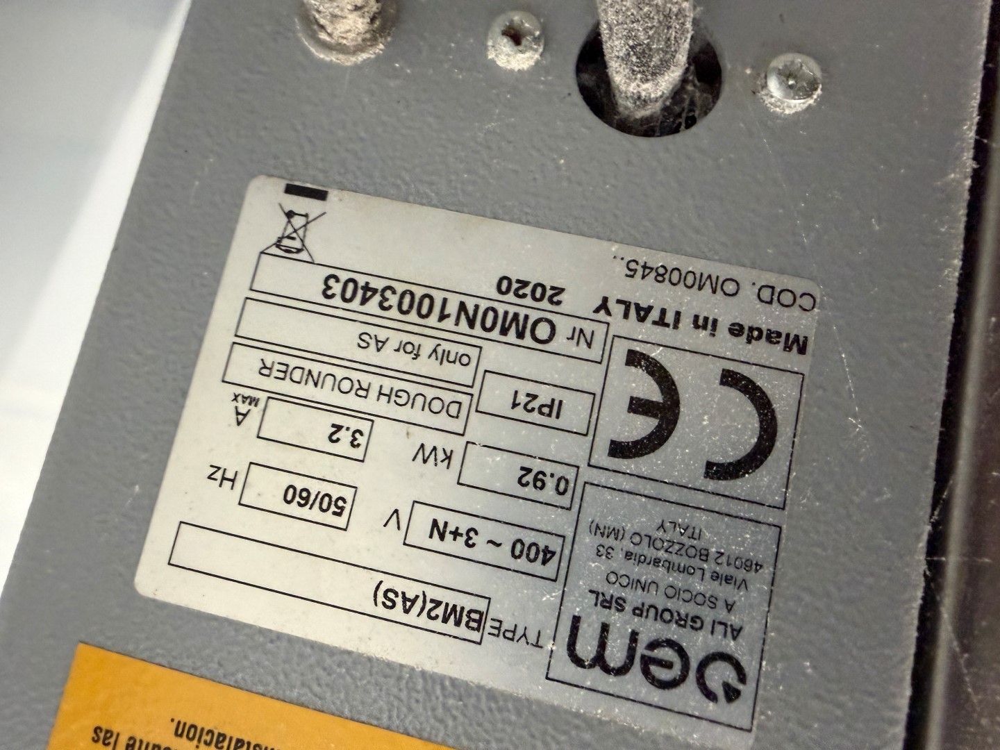 OEM BM2 (AS) Dough Divider/Rounder, YOM 2020, made in Italy, 3 ph, 0.92kw, on wheels, outfeed height approx. 500mm. Previously used to divide dough into Pizza base portions prior to rolling. Not available until approx. end of April 2026.