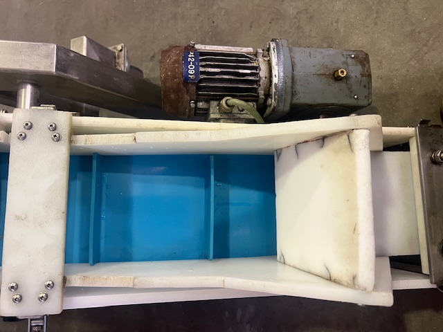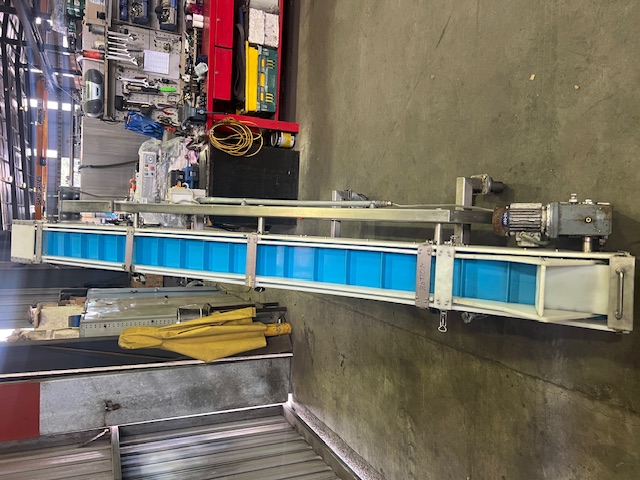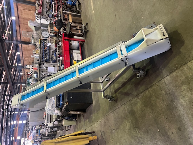 Elevator/Inclined Conveyor, cleated food grade belt, stainless steel frame, on lockable wheels, on/off controls, belt width 150mm, cleat height 40mm, space between cleats 150mm, infeed height approx. 450mm, outfeed height approx. 1700mm. Ex Food Industry unit.