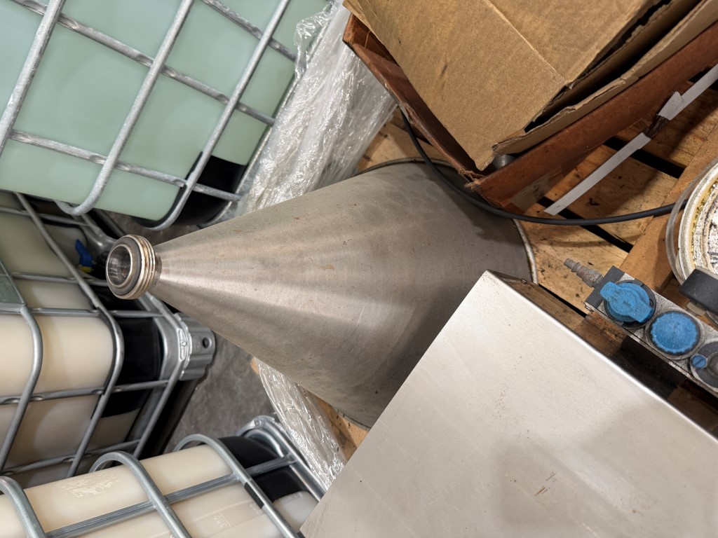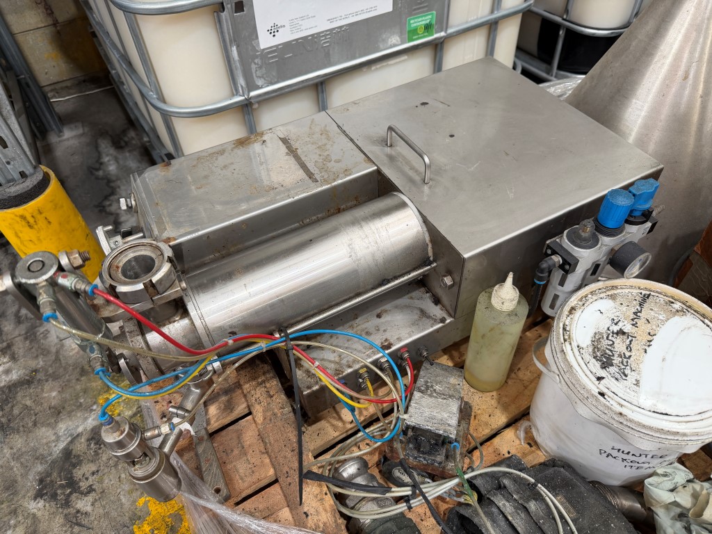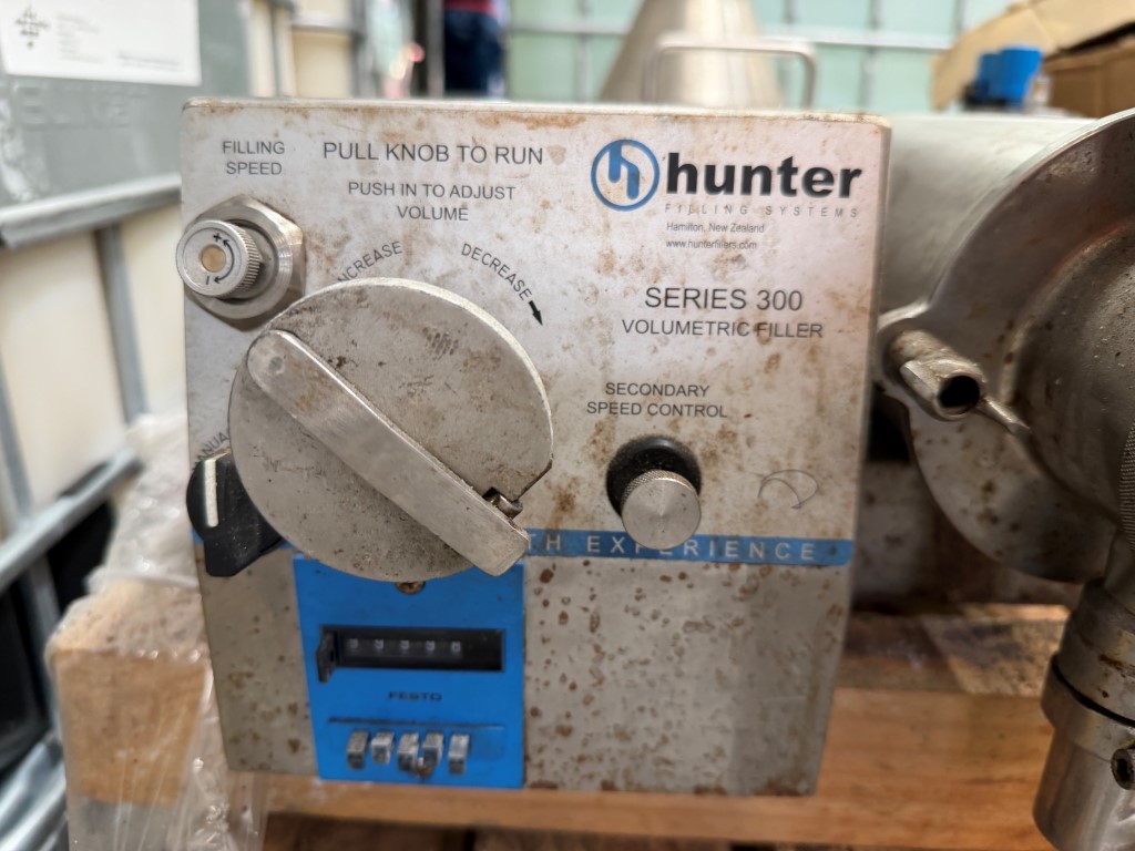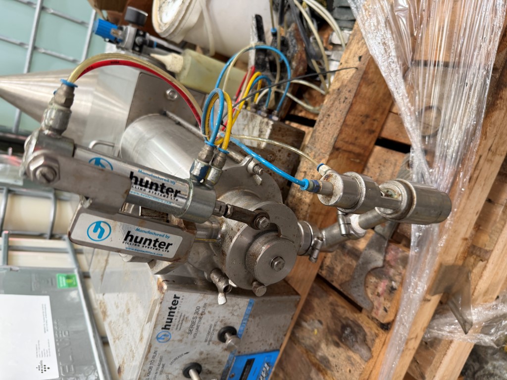 Hunter Series 300 Filler, pneumatic, single head, rotary valve, pedal operation, stainless steel, bench top unit, hopper, cylinder approx. 125mm Ø x 300mm L, fill sizes <2.5L, estimate 7mm nozzle.