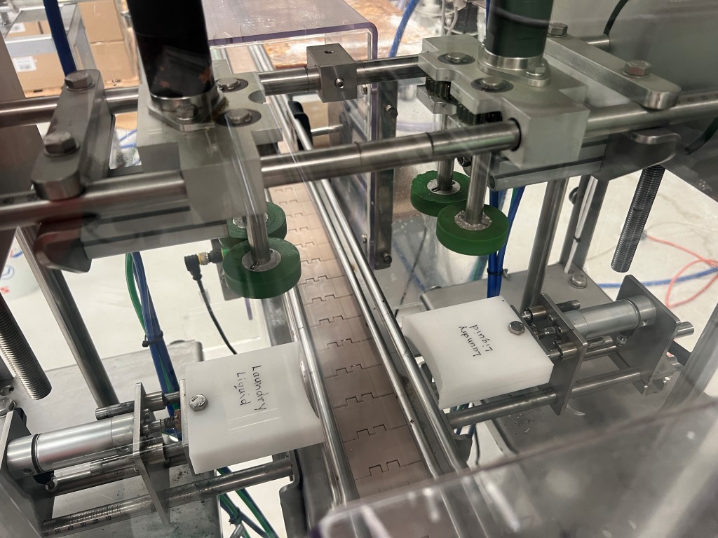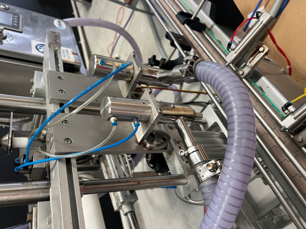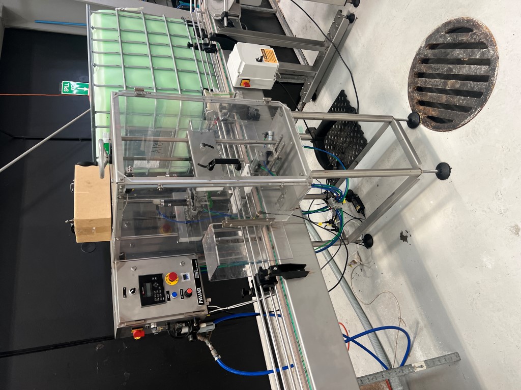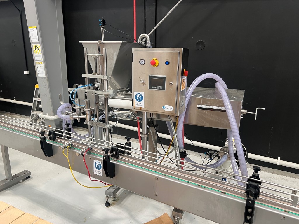 Filling Line consisting of 2 head Metica automatic Labeller for applying front and back self adhesive labels, 2 head Hunter 525b automatic Filler for 250-2000ml fills of liquid, diaphragm pump, 82mm wide slatband conveyor with gating system, Pavar CTSW Cap Tightener, 1200mm Ø Rotary Table for accumulation. Line was new in 2021. Previously used to fill cleaning products. Comes with operating manuals. Further information available.