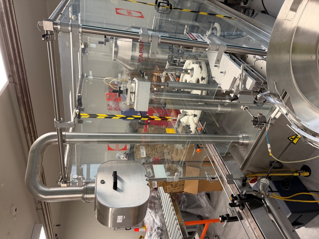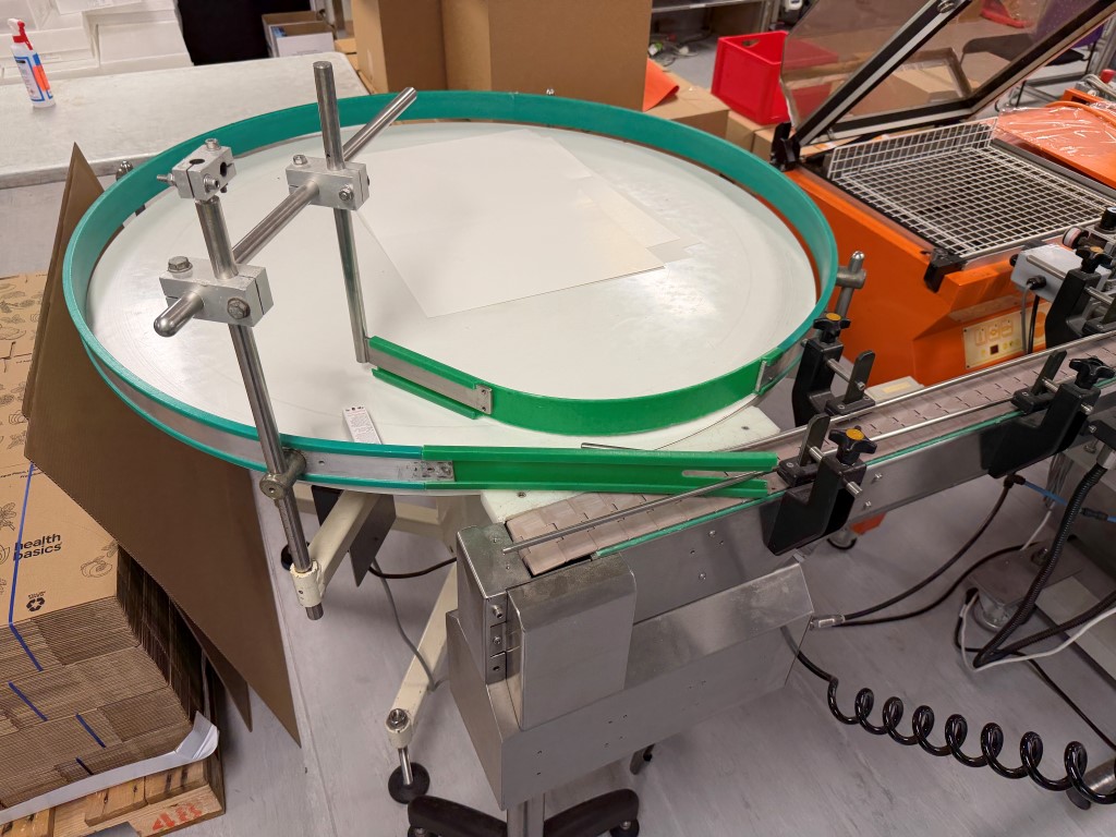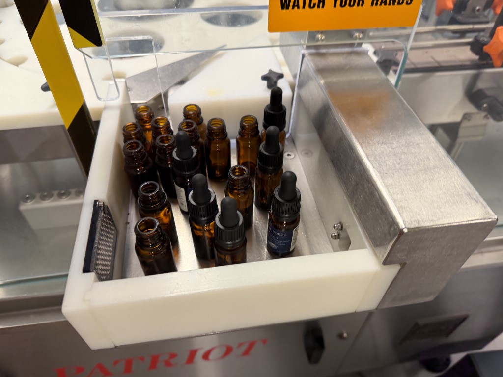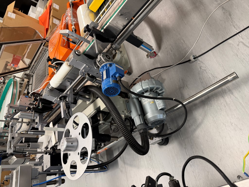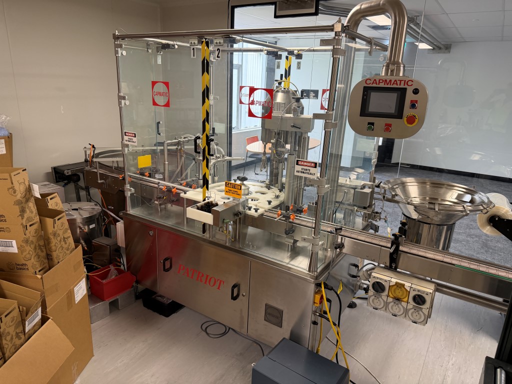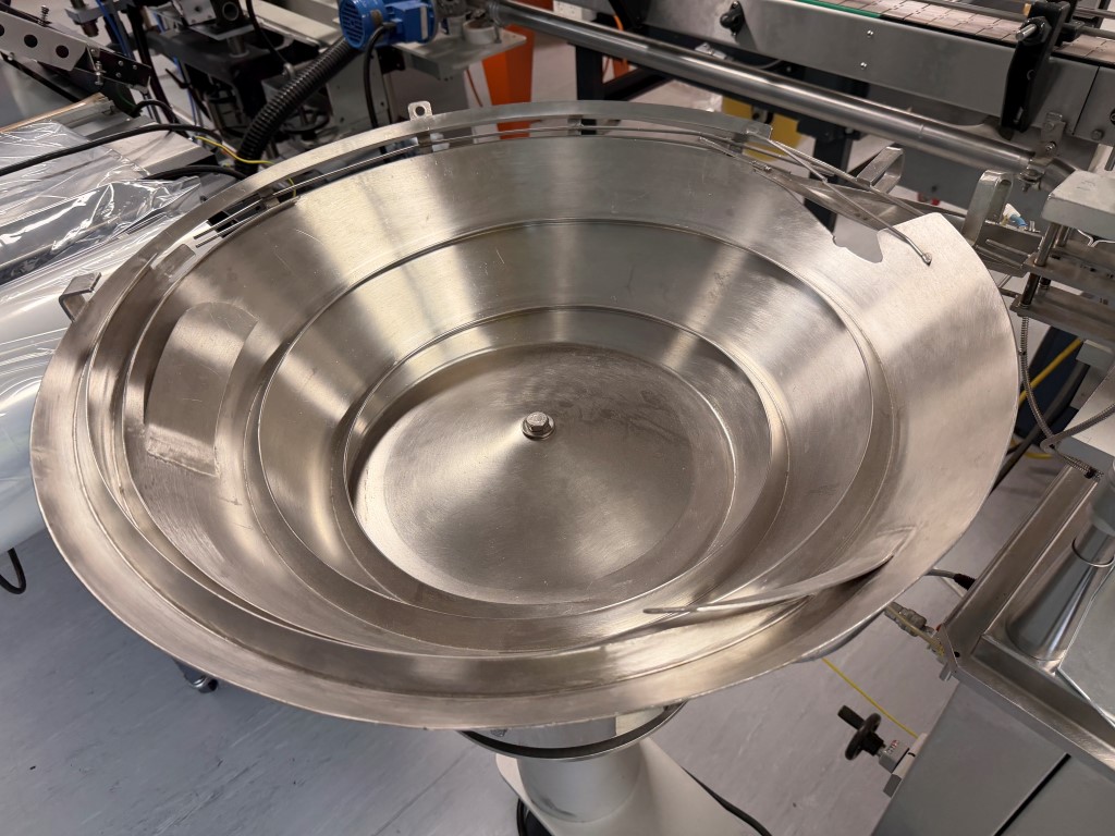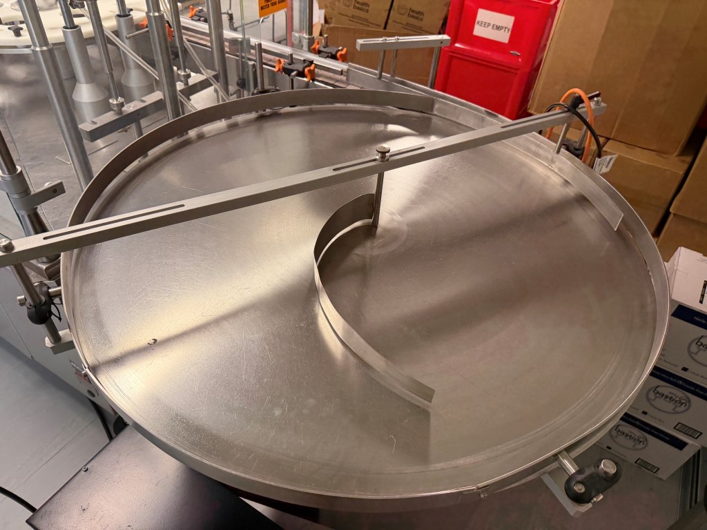 Filling Line consisting of bottle unscrambler (approx. 1000mm Ø), Capmatic Patriot Filler and Capper (with vibratory cap feeder), conveyor (82.6mm W slatband belt), Impresstik 2000 VAC single head wrap around labeller (existing label on machine 75mm L x 30mm H) with Flexicode coder, accumulation table (approx. 1200mm Ø). Set up for small filling of liquids (non viscous) e.g. eye droppers, nose sprays, vials etc. Filler and Capper has different change parts.