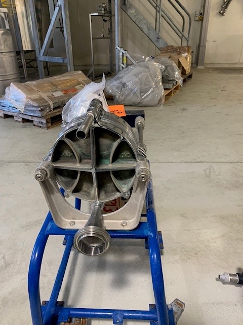 Filter Press, make unknown, stainless steel plates, painted steel mobile frame, comes with some filter pads, filter pads approx. 220mm Ø, dairy fitting 60mm ID, hose fitting 16.5mm ID.