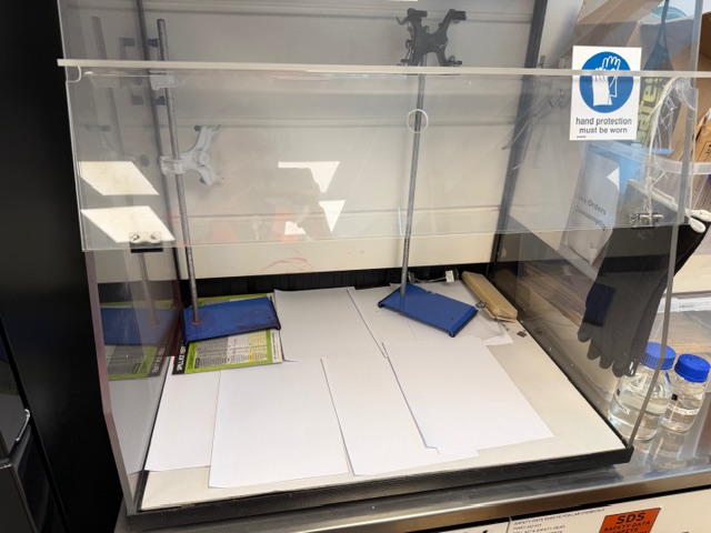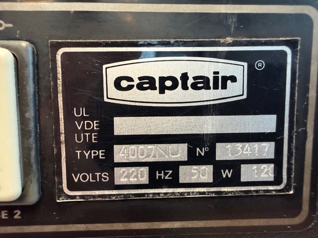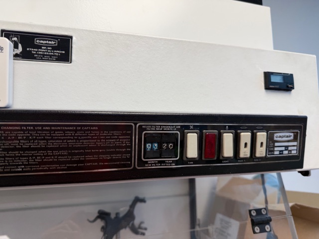 Captair type 4007NU Fume Cabinet, bench top unit, single phase, 12W, has fan and light, fold down perpex cover, has gap at bottom to be able to insert hands.