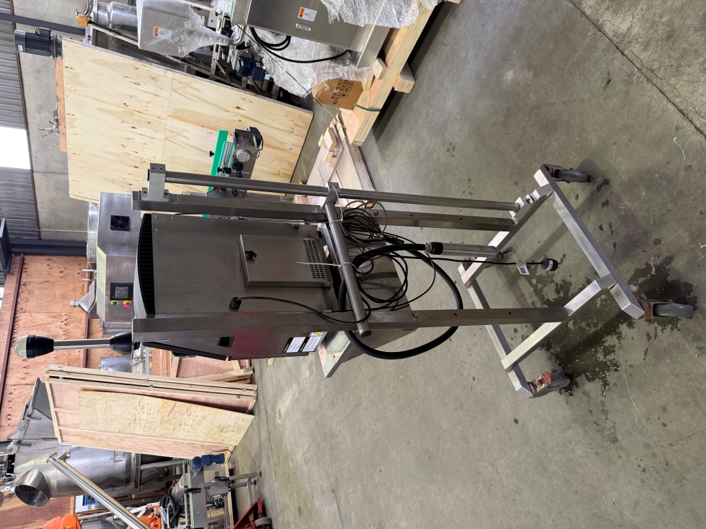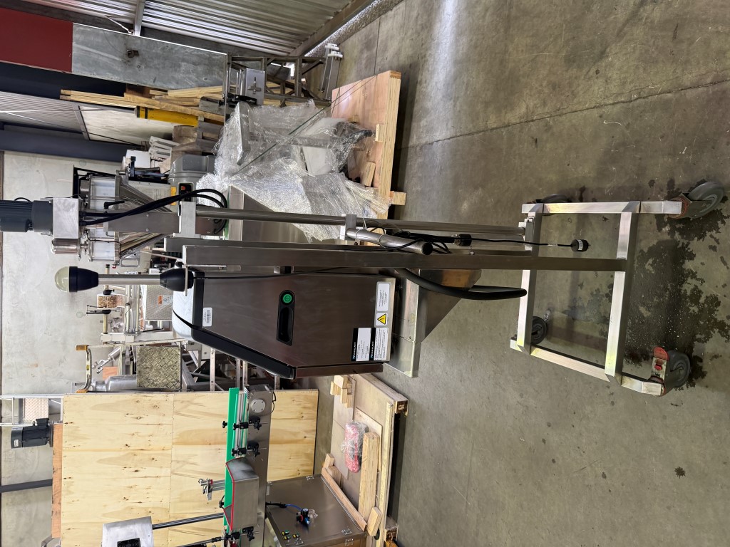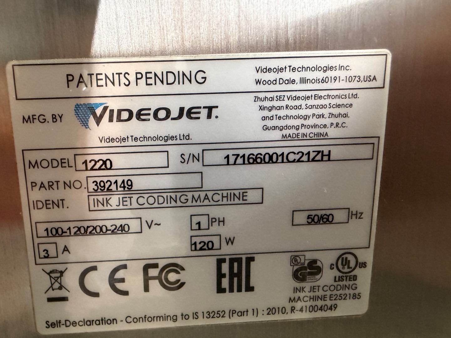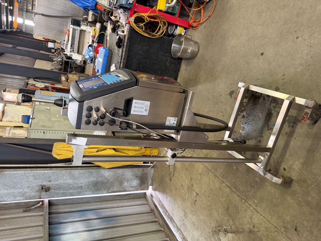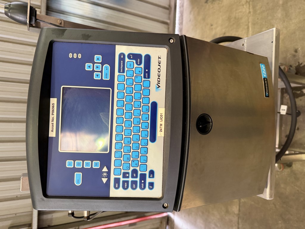 Videojet 1220 Ink Jet Printer on mobile stand, single phase, has not been used for a while, will need a service prior to being put back into service. Further info: https://global.videojet.com/wp-content/uploads/dam/pdf/NA%20-%20English/VJ-1220-SpecSheet-070912.pdf.