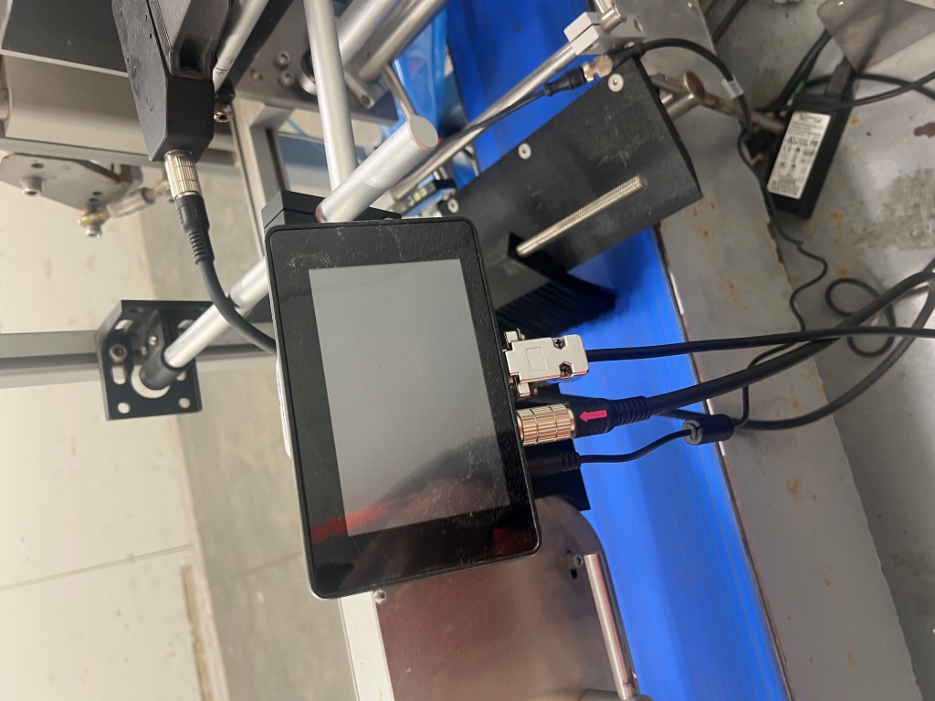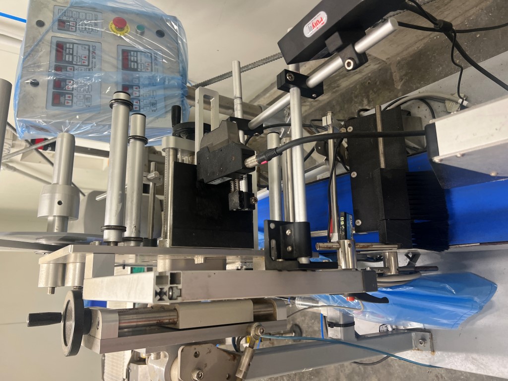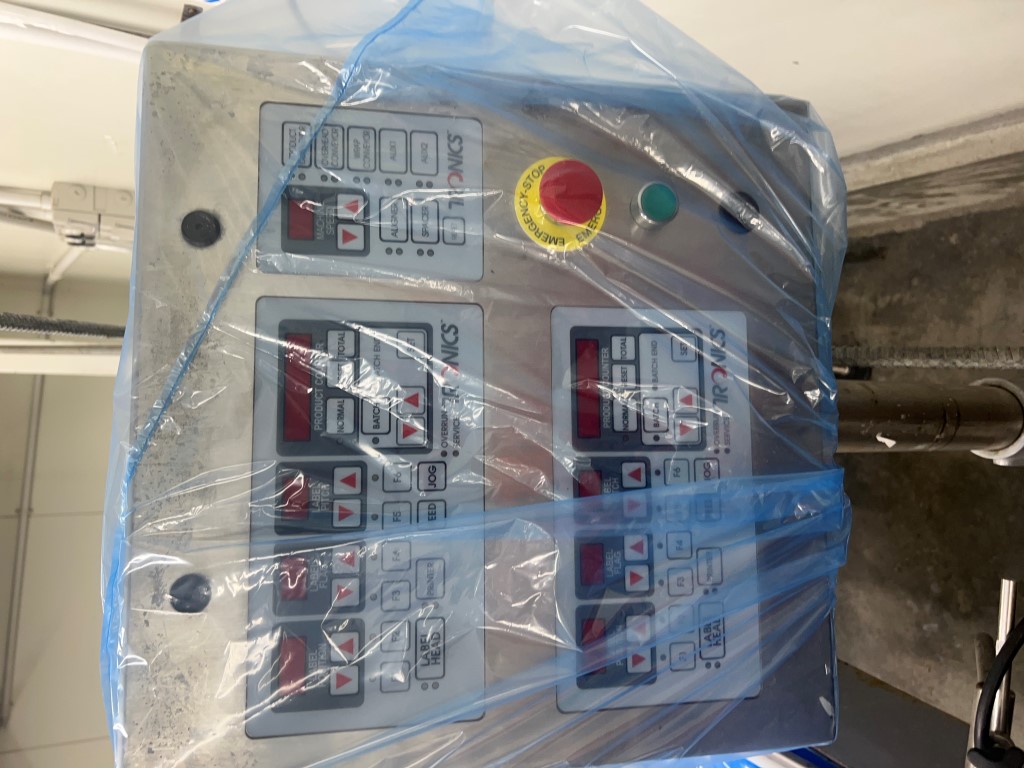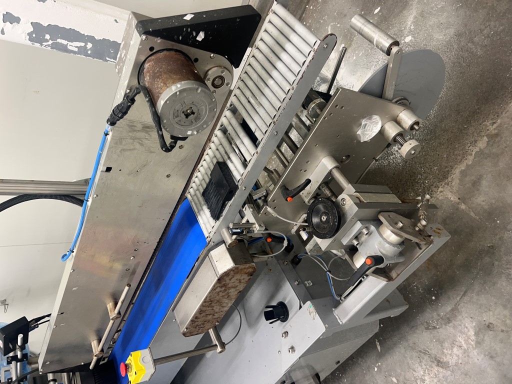 Tronics 2 Head Labeller, single phase, pneumatic, conveyorized (approx. 190mm W x 3000mm L), includes Poly Tij Printer, used to apply top and bottom self adhesive labels to bowls of product.