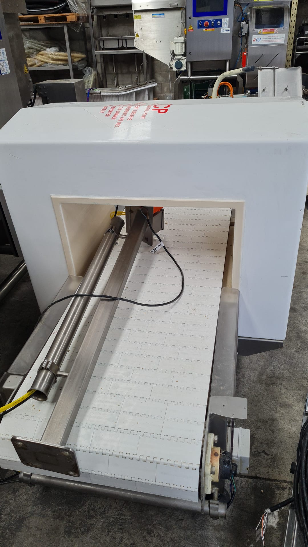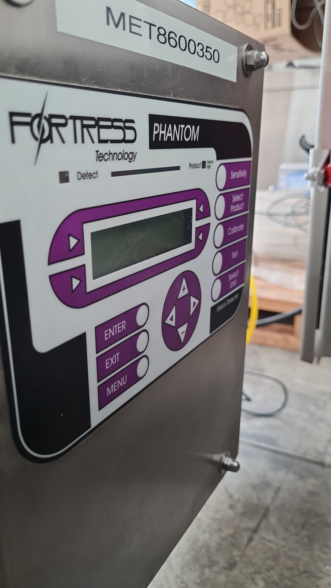 Fortress Phantom Metal Detector, 3 ph, conveyorised, stainless steel frame, last calibration was to March 2026, aperture approx. 590mm W x 300mm H, belt width 525mm, infeed height 450mm, outfeed height 650mm.