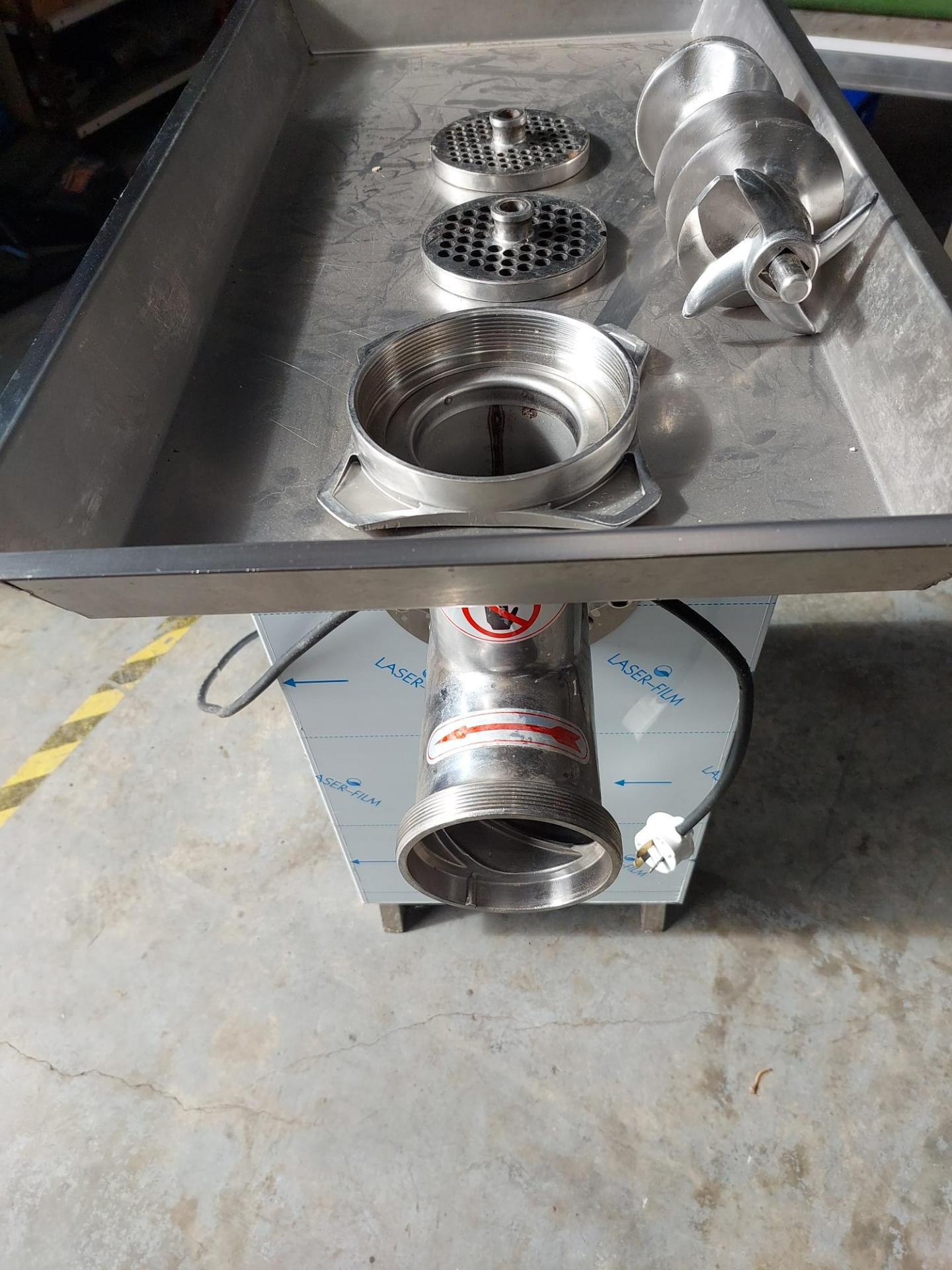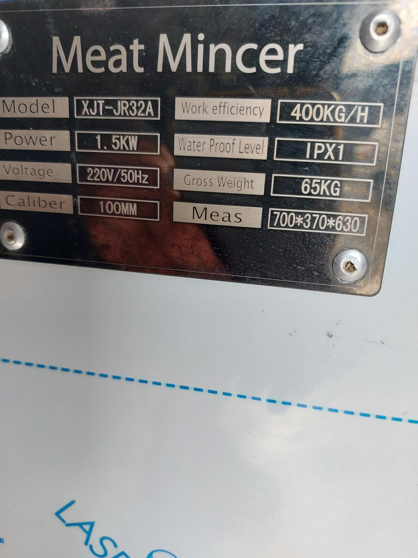 Mincer, model XJT-JR32A, single phase, 1.5kw, stainless steel, approx. 70mm ID inlet, 100mm ID throat/outfeed, 2 plates – 5mm and 6mm holes, approx. 400kg/hr.