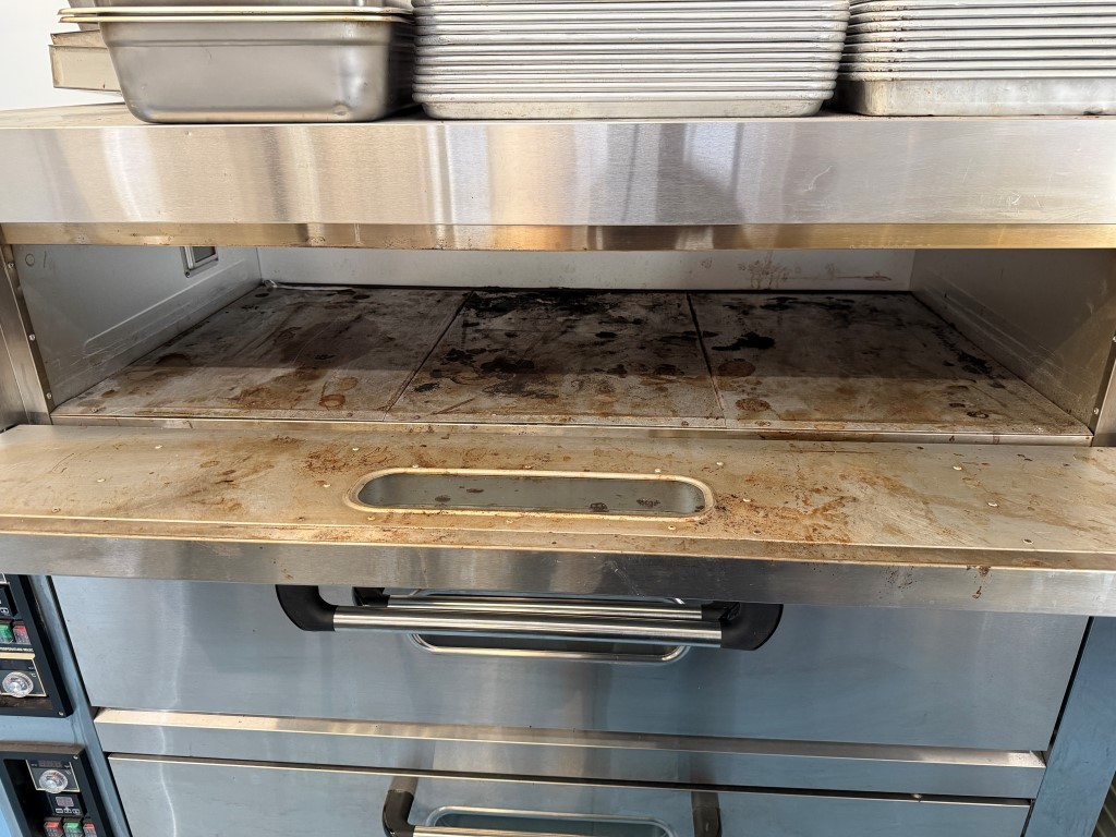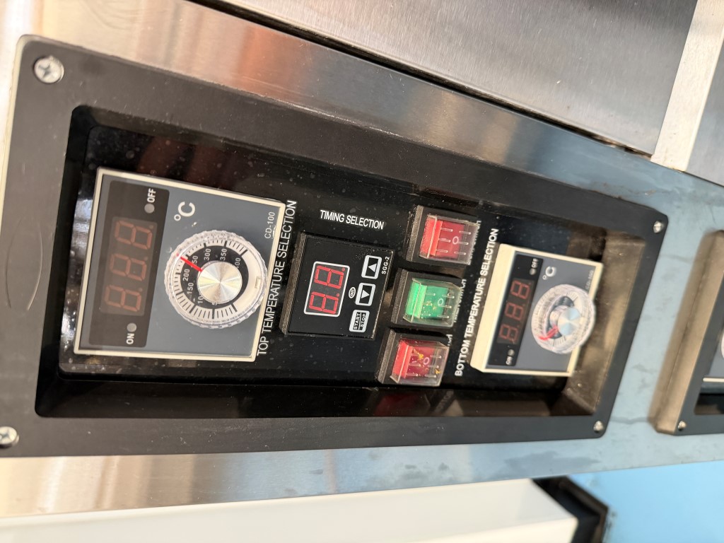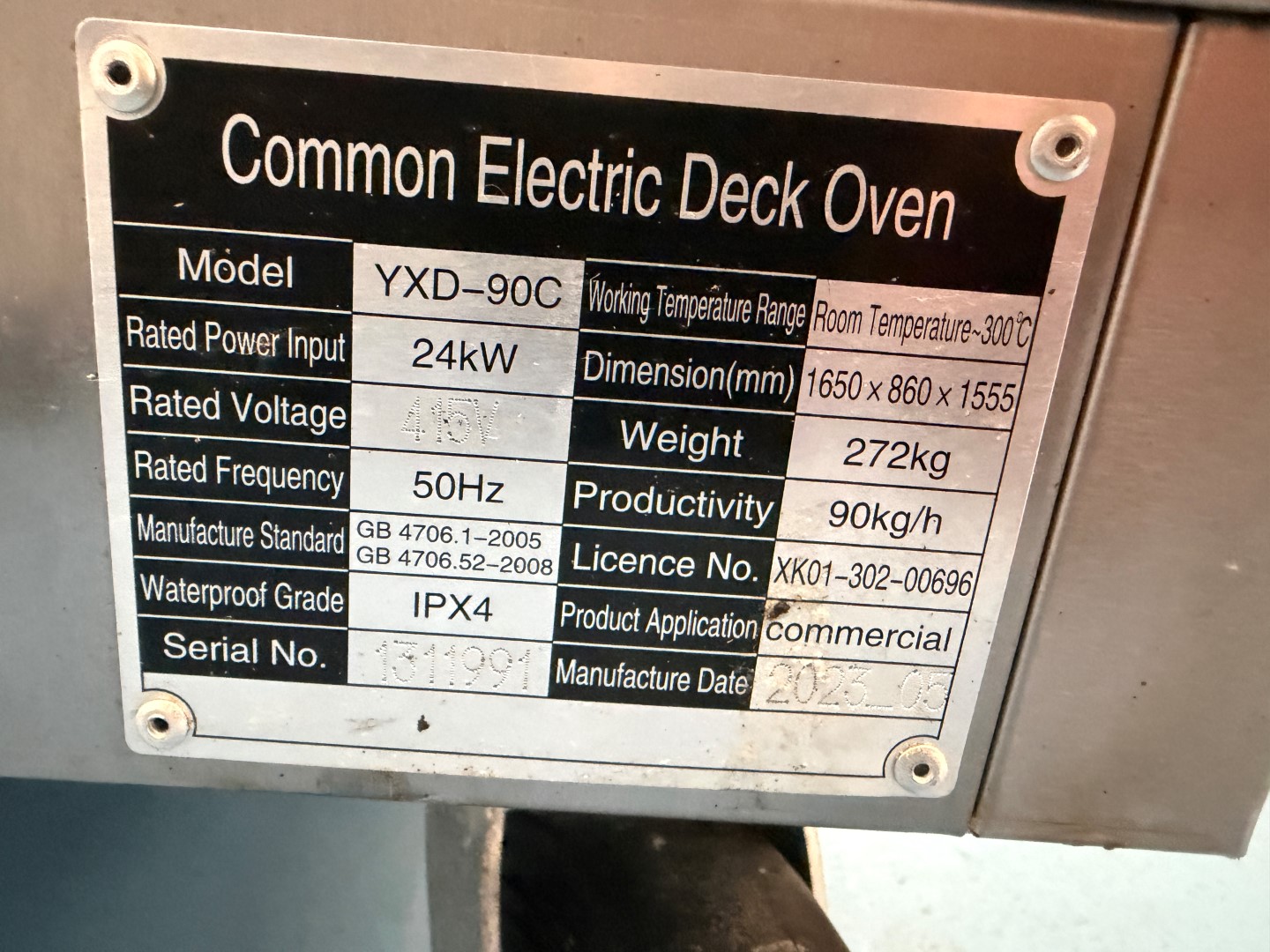 YXD-90C Deck Oven, YOM 2023, 3 ph, 24kw, room temp-300 degrees Celcius, cooking deck area approx. 1300mm x 635mm x 215mm H per deck, on wheels. Not available until approx. end of April 2026.