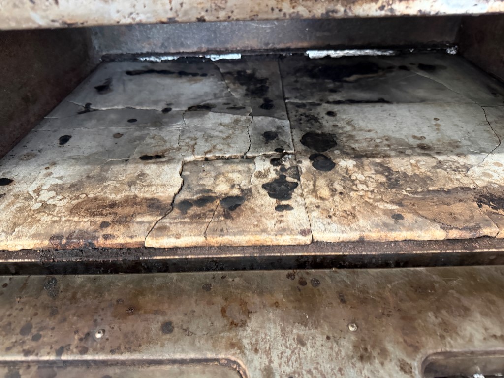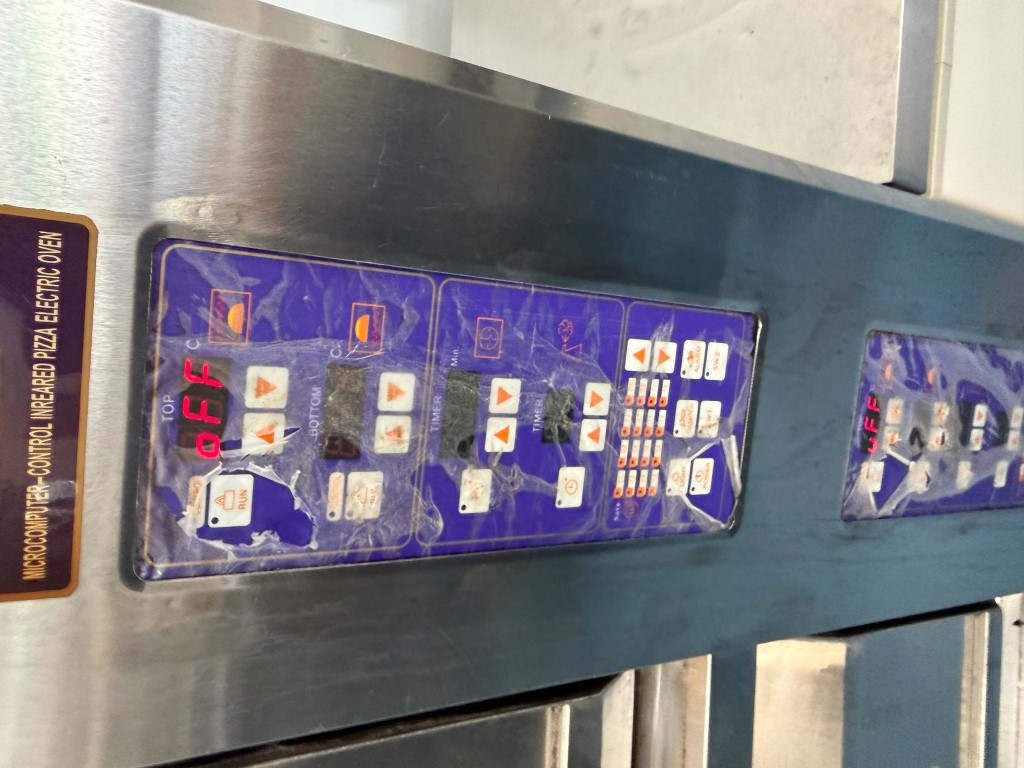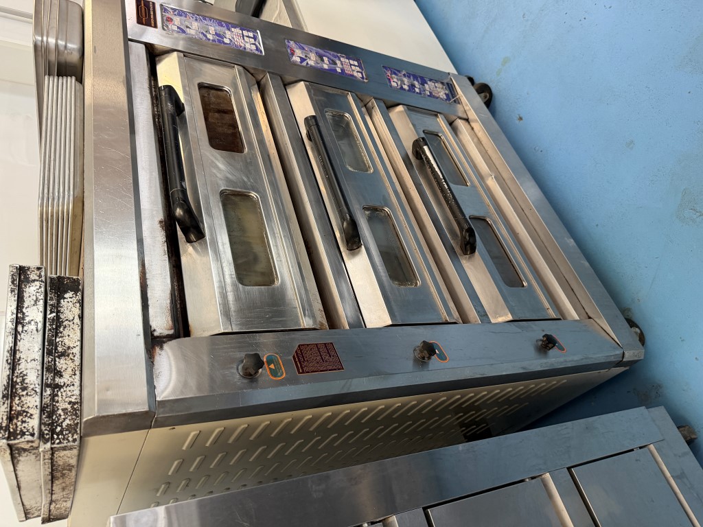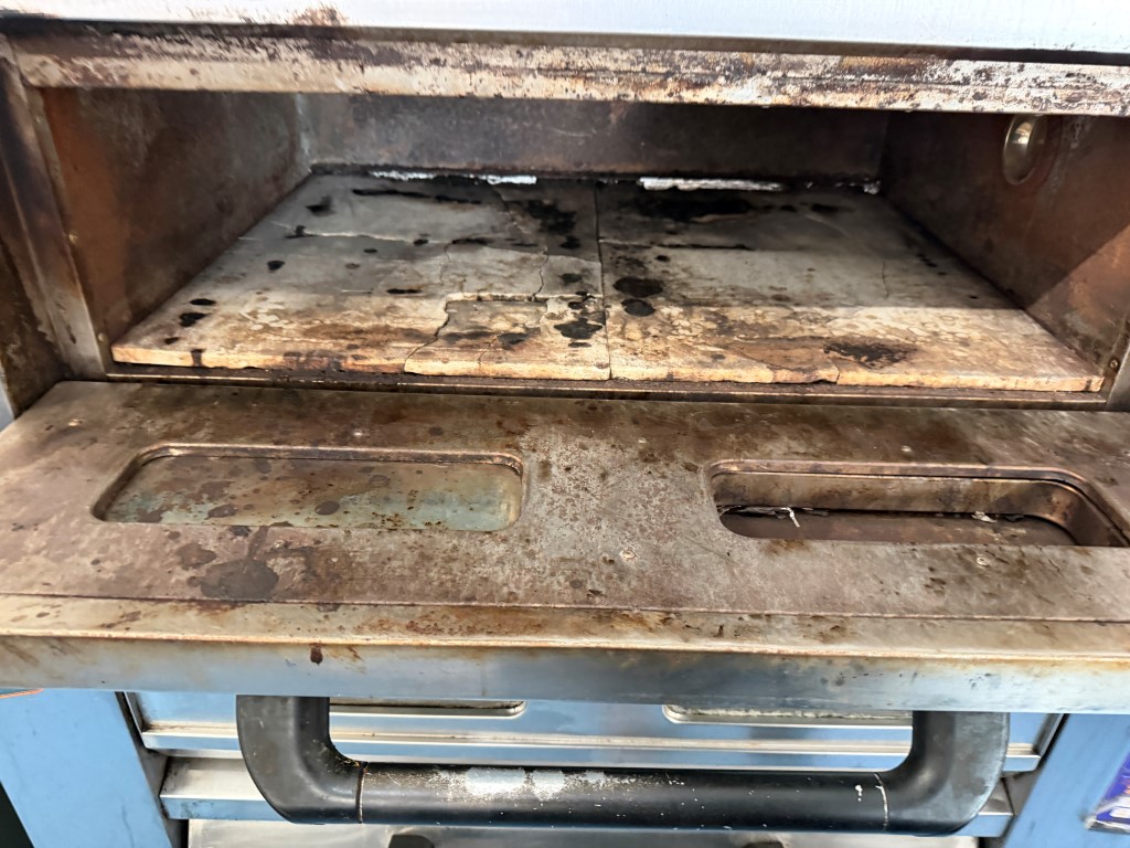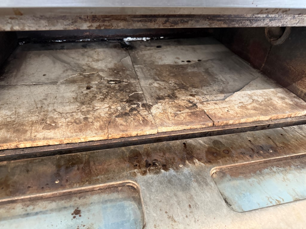 PEO-6A Deck Oven, YOM 2013, 3 ph, 25kw, room temp-400 degrees Celcius, cooking deck areas approx. 850mm x 620mm x 215mm H per deck, on wheels, stones in each deck need replacing (cracked). Not available until approx. end of April 2026.