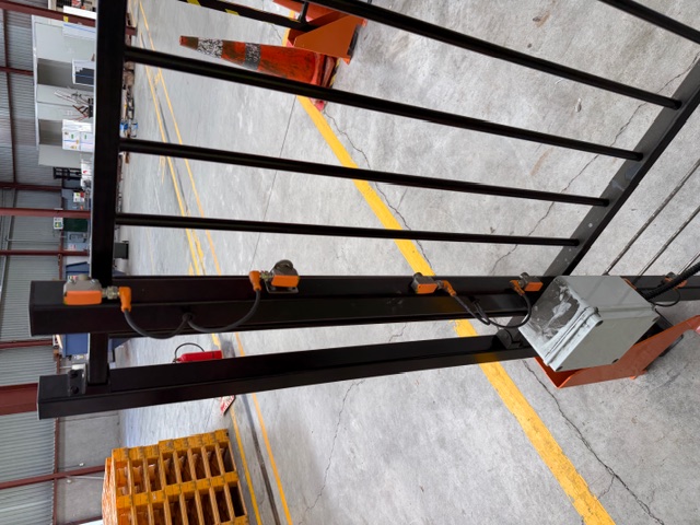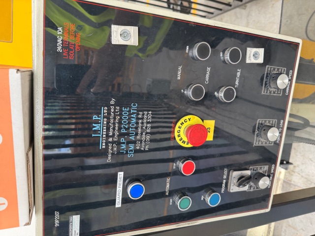 JMP 2000E Semi-Automatic Pallet Wrapper, single phase, automatic/manual/speed controls, includes fencing/guarding and safety sensors to shut off unit if operator enters guarded area.