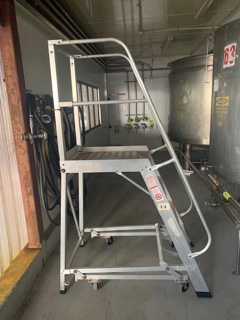 Platform Steps, aluminium, mobile, platform height approx. 1100mm, platform size approx. 600mm W x 700mm L, o’all dims approx. 730mm W x 1300mm L x 2000mm H.