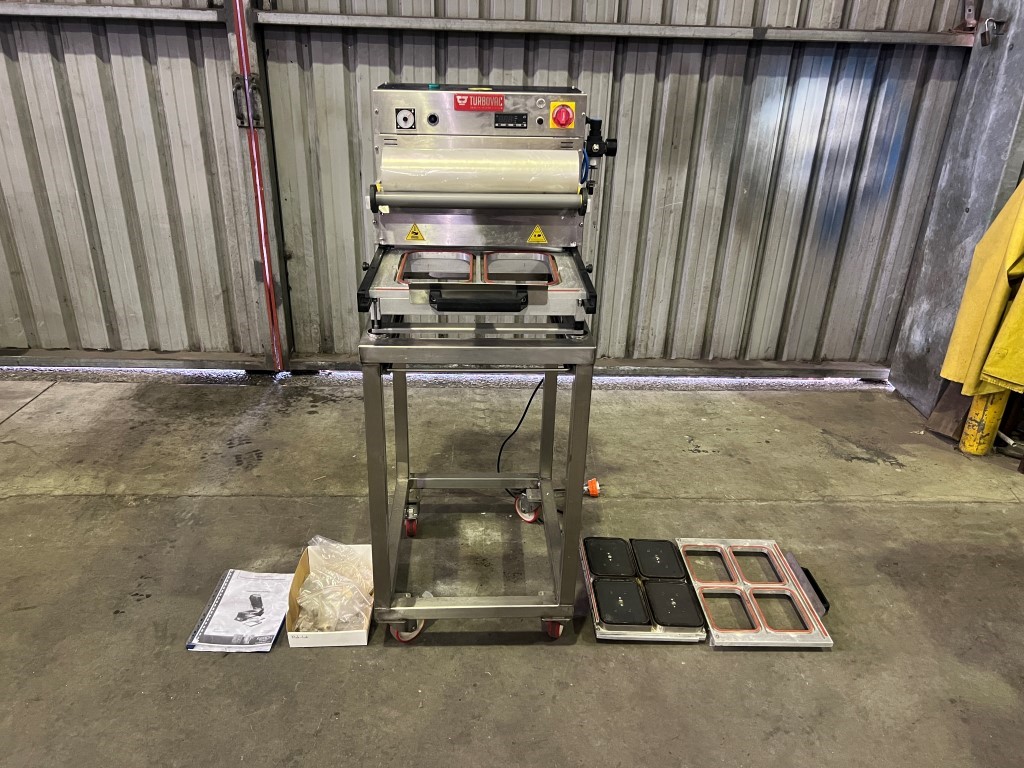 Pot Sealer, single phase, requires compressed air. Machine can be integrated with pneumatic filling machine. Operator manually places pots into stations, pre-cut film is placed onto the pot and heat sealed. Ex Yoghurt machine.