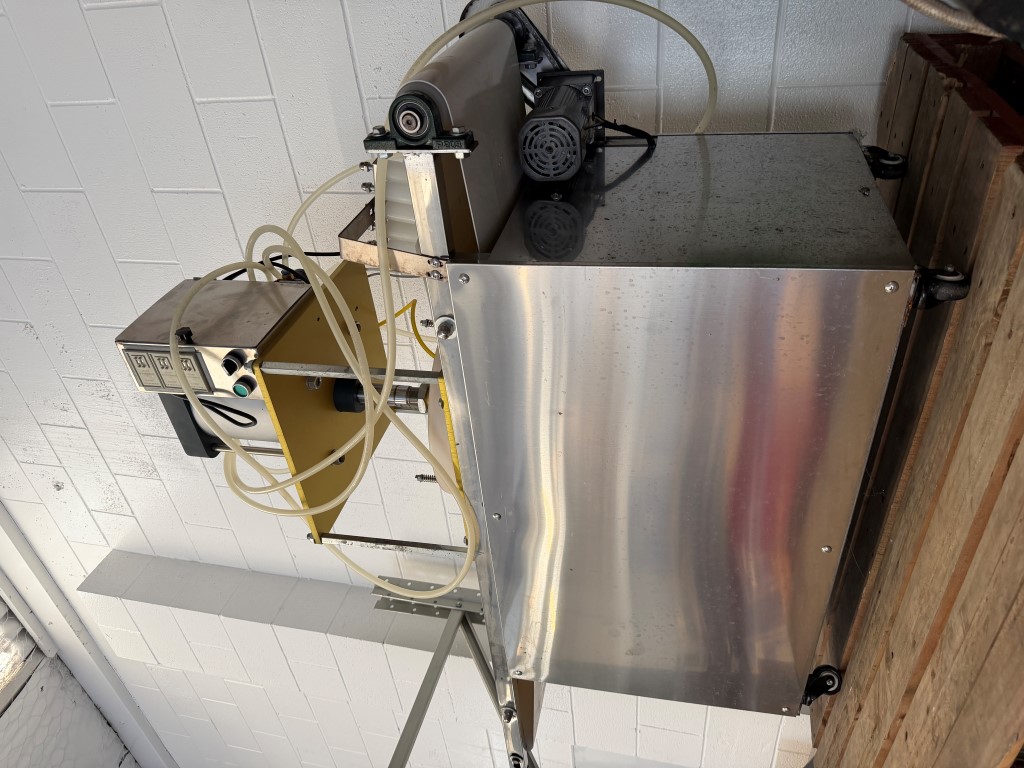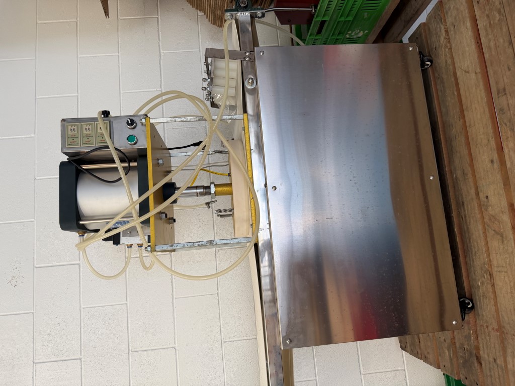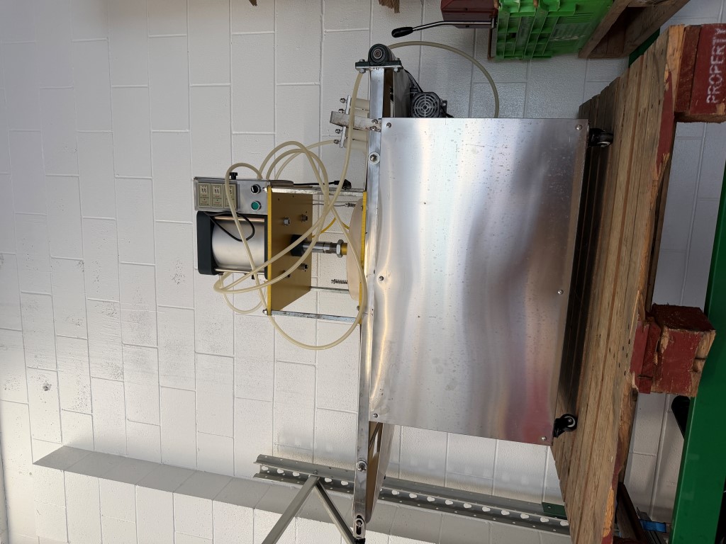 Press, conveyorised, single phase and pneumatic, on wheels, was designed to press dough balls into pizza bases. Not available until approx. end of April 2026.