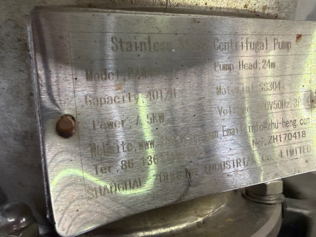 Shanghai Zhuheng BAW40-24-7.5 Centrifugal Pump, 3 ph, 7.5kw, capacity up to approx. 40T/HR, stainless steel contact parts.
