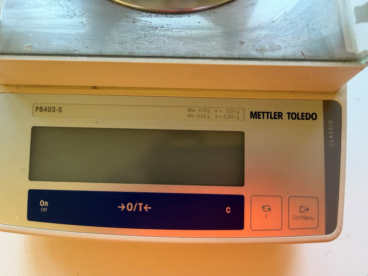 Mettler Toledo PB403-S Balance Scale, single phase, bench top, stainless steel top – approx. 98mm Ø, max 410g, min 0.02g, e=0.01g, d=0.001g. Available from second half of February 2026.