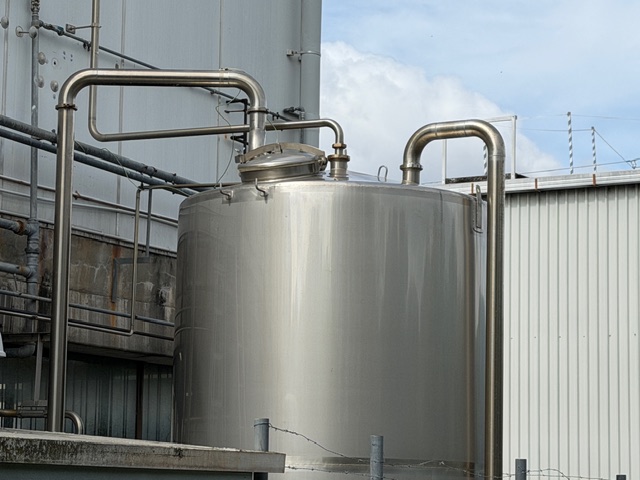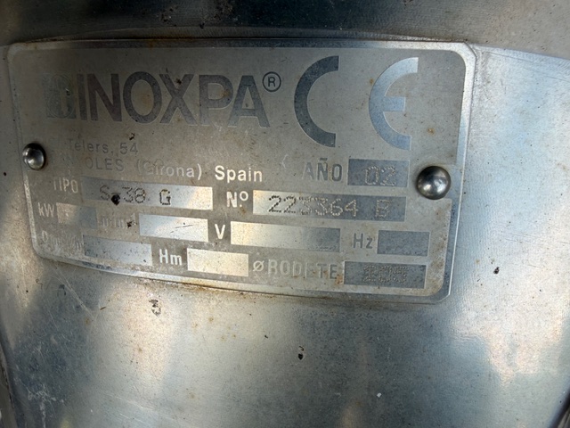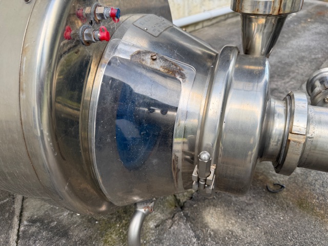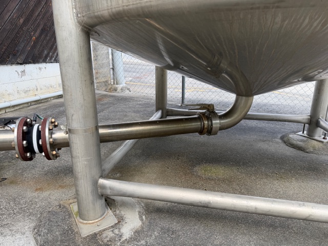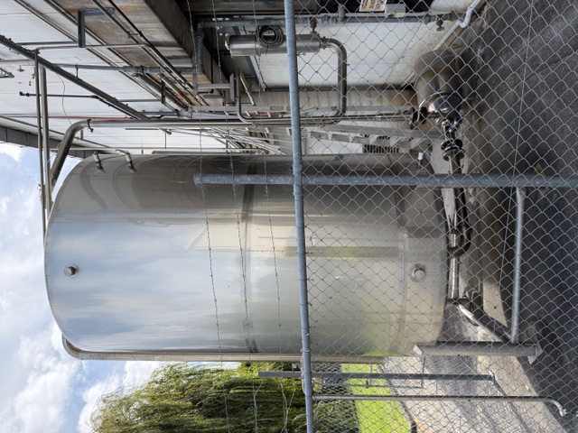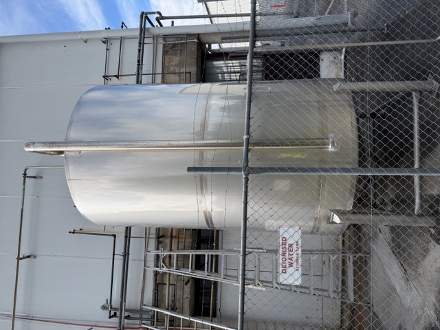 Stainless Steel Tank, single skin, enclosed, top manhole, lifting points, slightly conical bottom, 4” central bottom out, ex de-ionised water tank, includes Inoxpa S-38-G pump, o’all dims of tank approx. 1920mm Ø x 4.1m H.
