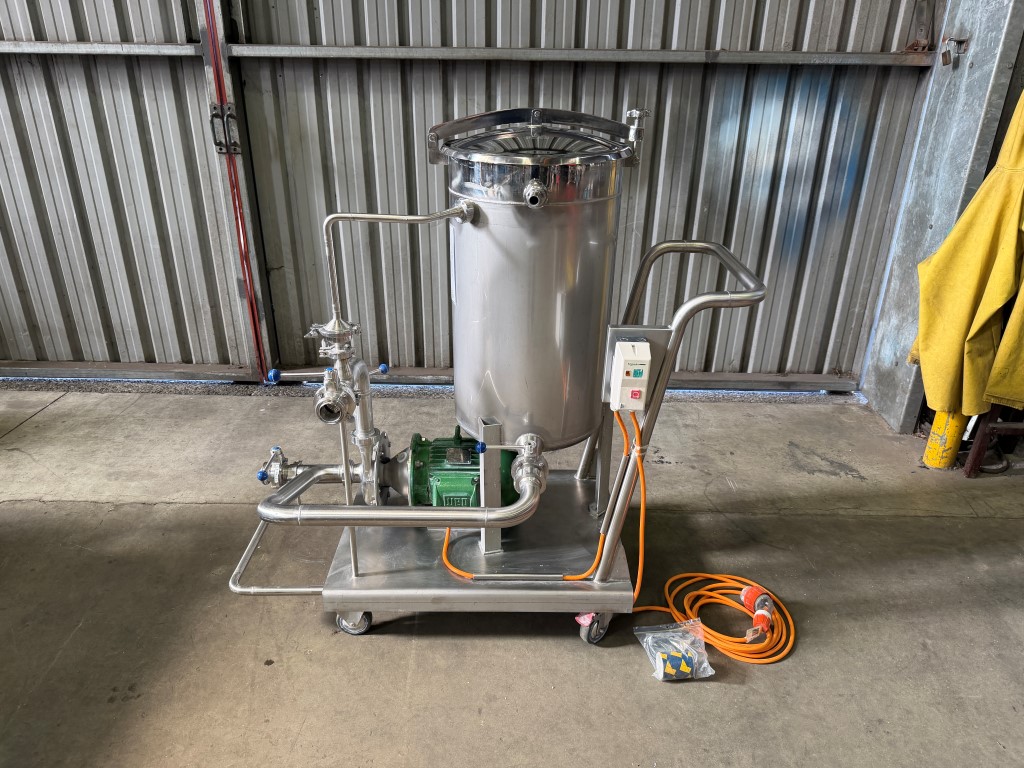 Stainless Steel Tank, open top, single phase stirrer, side bottom outlet, on wheels, ex Cheese tank. Ext dims approx. 1550mm Ø, height to top of motor 1800mm, height to top of tank 1020mm.