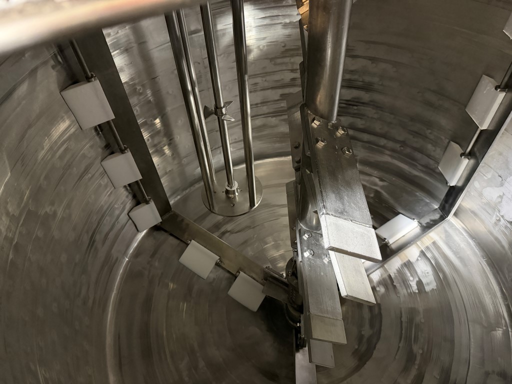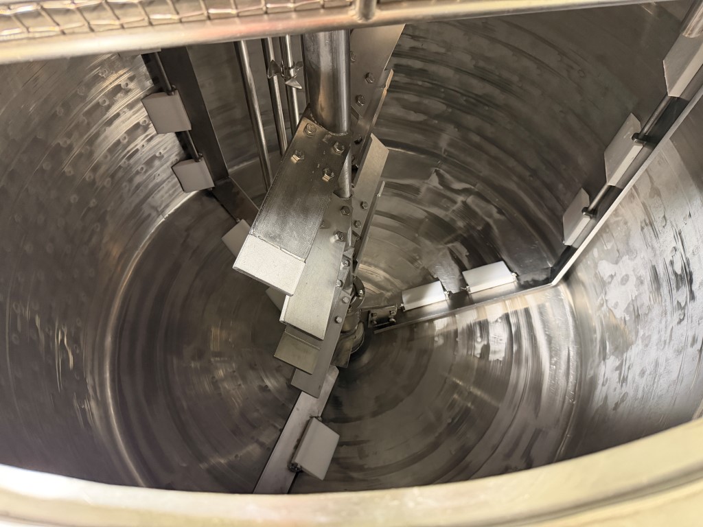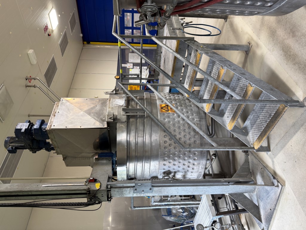 Stainless Steel Tank, with platform and stairs, steam/water jacket, 316 stainless steel internals, 3ph, contra rotating mixing with scrape surface blades, 5.5kw SEW motor, 211rpm, Silverson GX10 Batch Emulsifier on hydraulic lifter, variable speed, pneumatic lid, safety mesh. Ex Cosmetic product tank. Available from second half of February 2026.