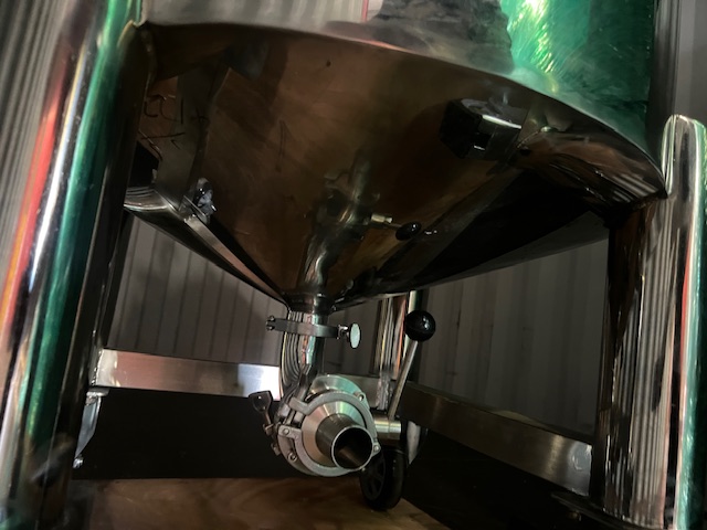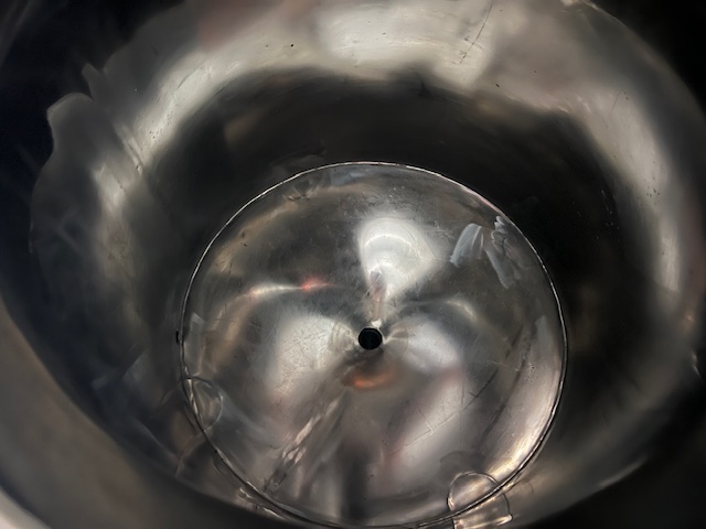 Stainless Steel Tank, single skin, enclosed, top manhole, spray ball, top vent, on wheels, central bottom outlet.