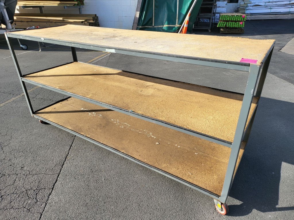 4 x Steel Industrial Trolleys with Castor Wheels. The trolley frame is constructed from 40 x 40 x 2mm angle iron and topped with an MDF board. This board is supported by a cross member through the centre of the trolley. In used condition - shows wear and tear (scratches, surface marks, a bit of rust on the frame), but structurally strong and functional.