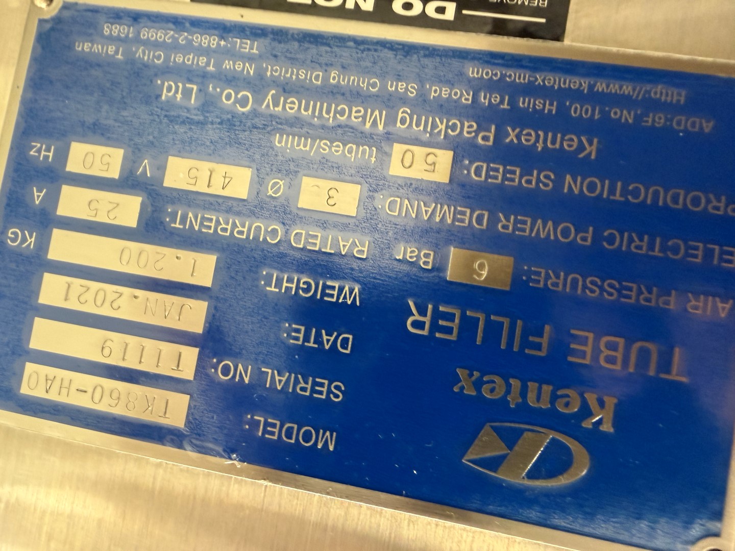 Kentex TK860-HAO Tube Filler and Sealer, YOM 2021, 3 ph, pneumatic, hot air sealing, no stirrer on hopper, approx. 50 tubes/min, vendor should be able to supply tube holders to suit.
