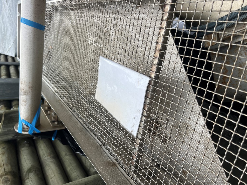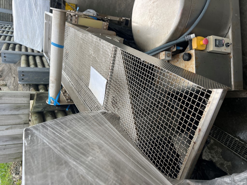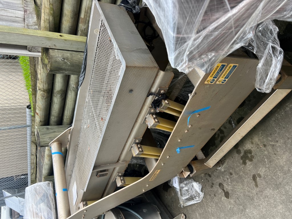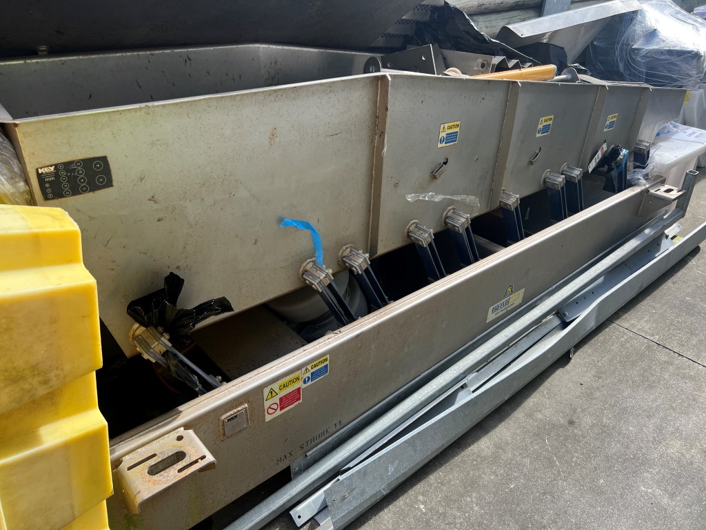 Key Technology Iso-Flo Vibratory Feeder/Conveyor, 3 ph, stainless steel, mesh on top (approx. 18mm x 18mm), tray dims approx. 600mm W x 2950mm L x 1050mm H. Ex Vegetable unit.