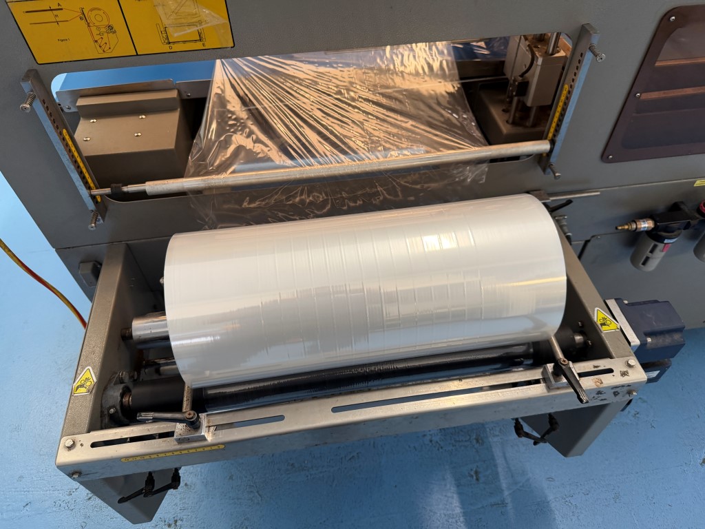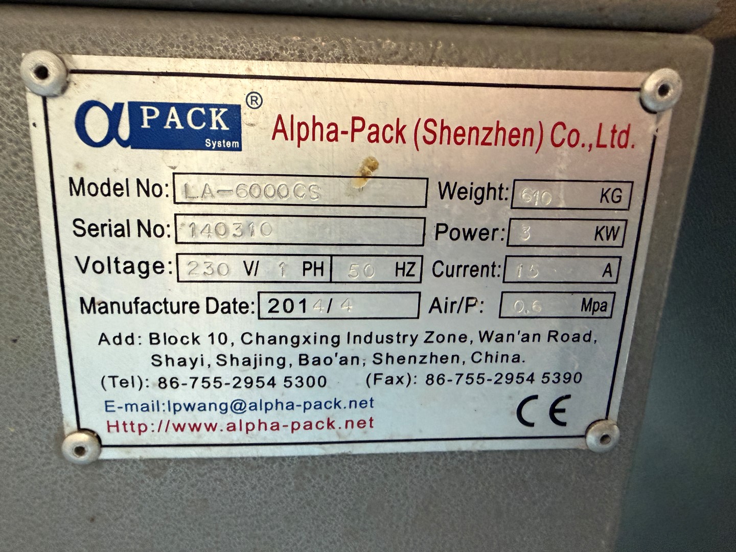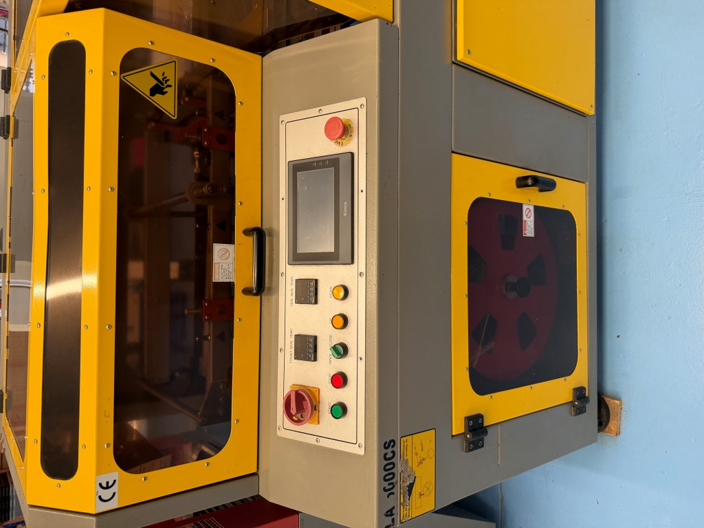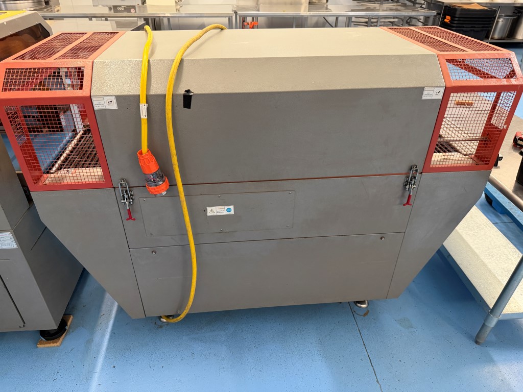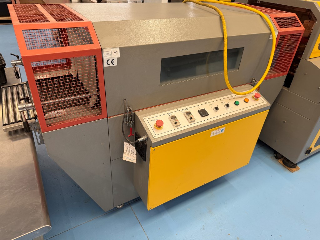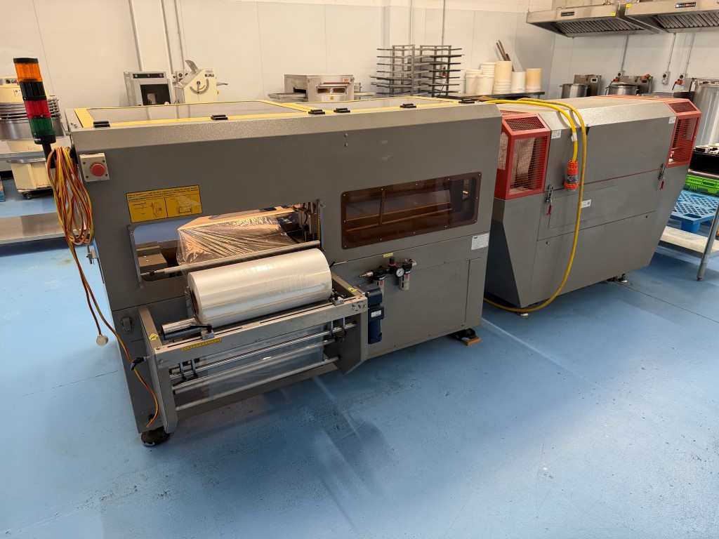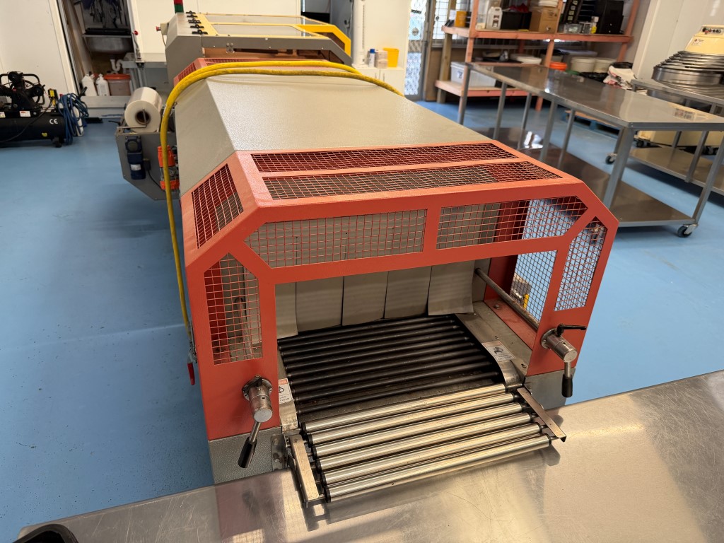 Alpha-Pack LA-6000CS Wrapper, YOM 2014, single phase, pneumatic, belt width 385mm, existing film width 505mm. Alpha-Pack TLA-1245 Shrink Tunnel, YOM 2014, 3 ph, tunnel aperture approx. 450mm W x 310mm H. Previously used to shrink wrap single pre-made pizza boxes. Not available until approx. end of April 2026.
