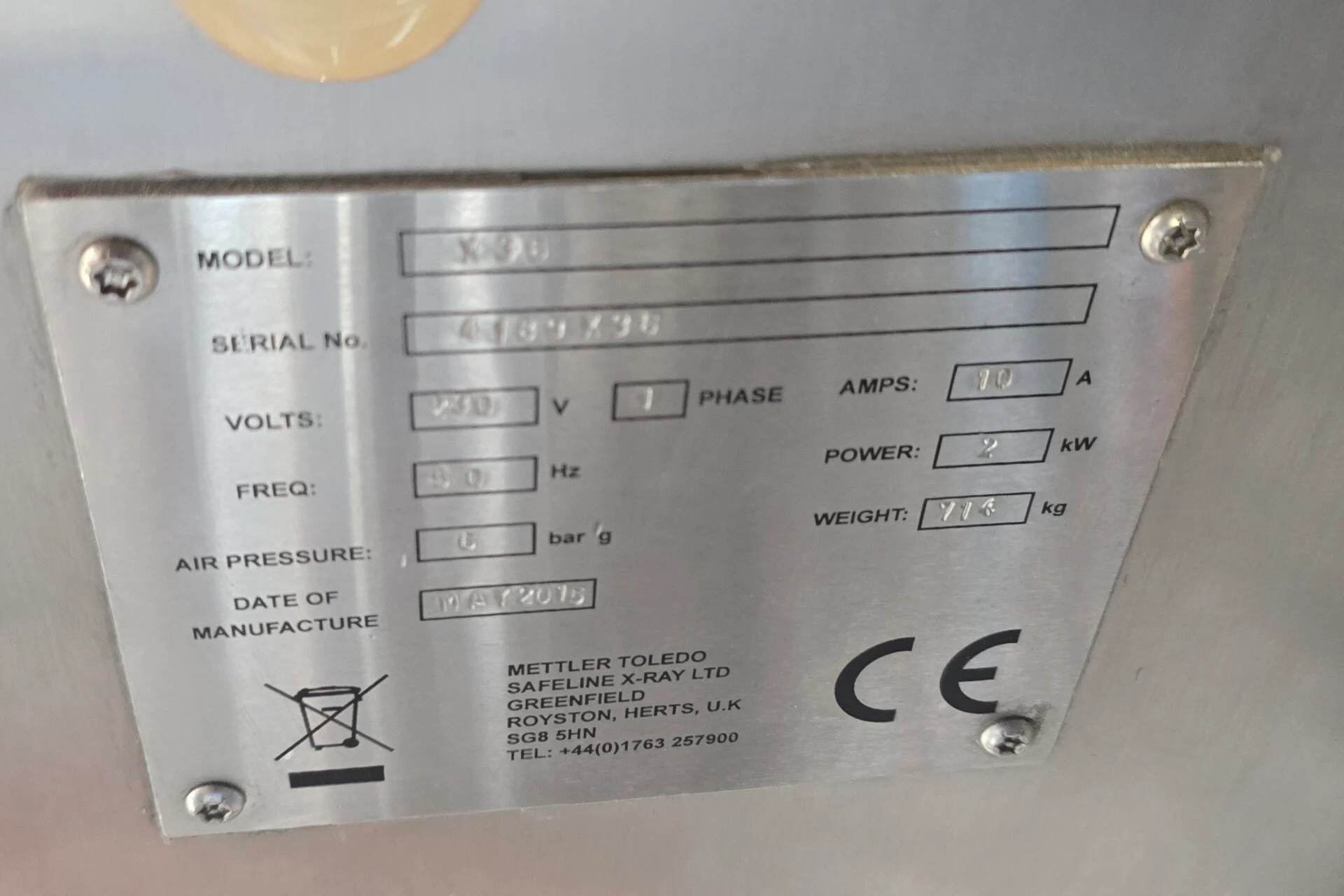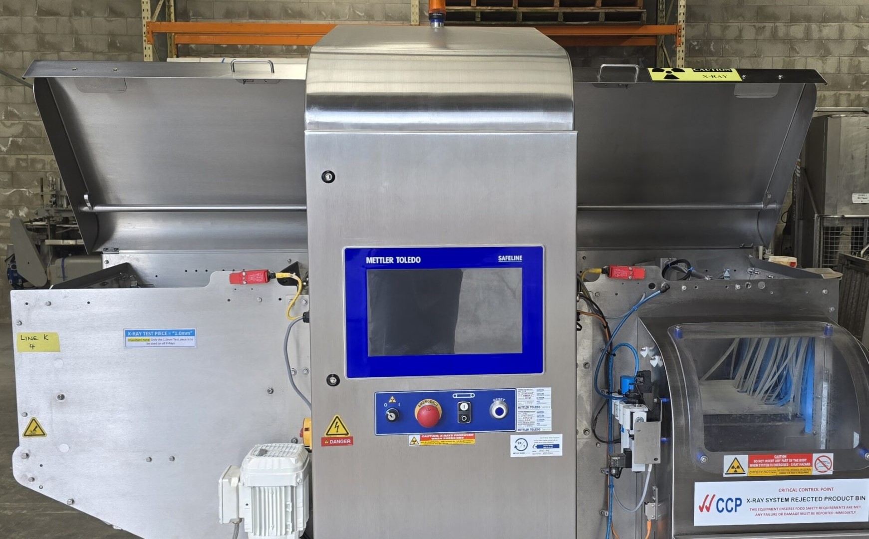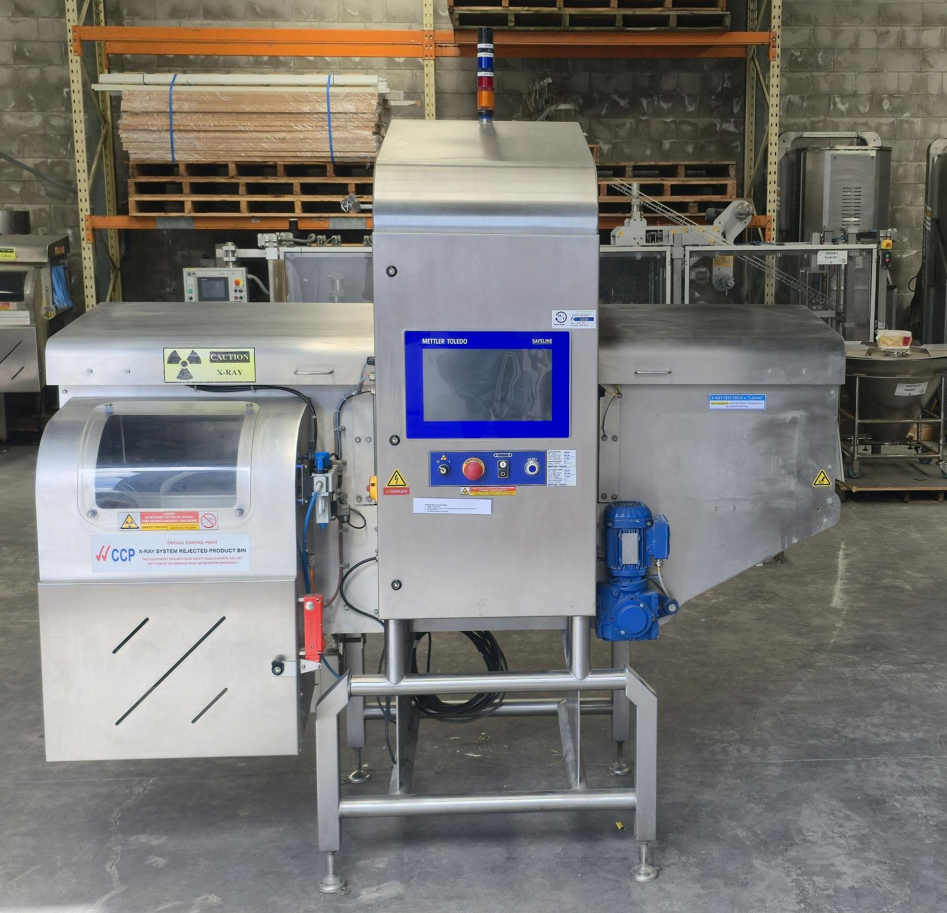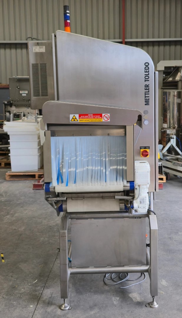 Mettler Toledo X36 X-ray, YOM 2015, single phase, pneumatic, conveyorised, 430mm W belt, currently setup to detect 1mm Ø 316 stainless steel, pneumatic rejection arm into a lockable reject box, fully enclosed with all safety shields in place.